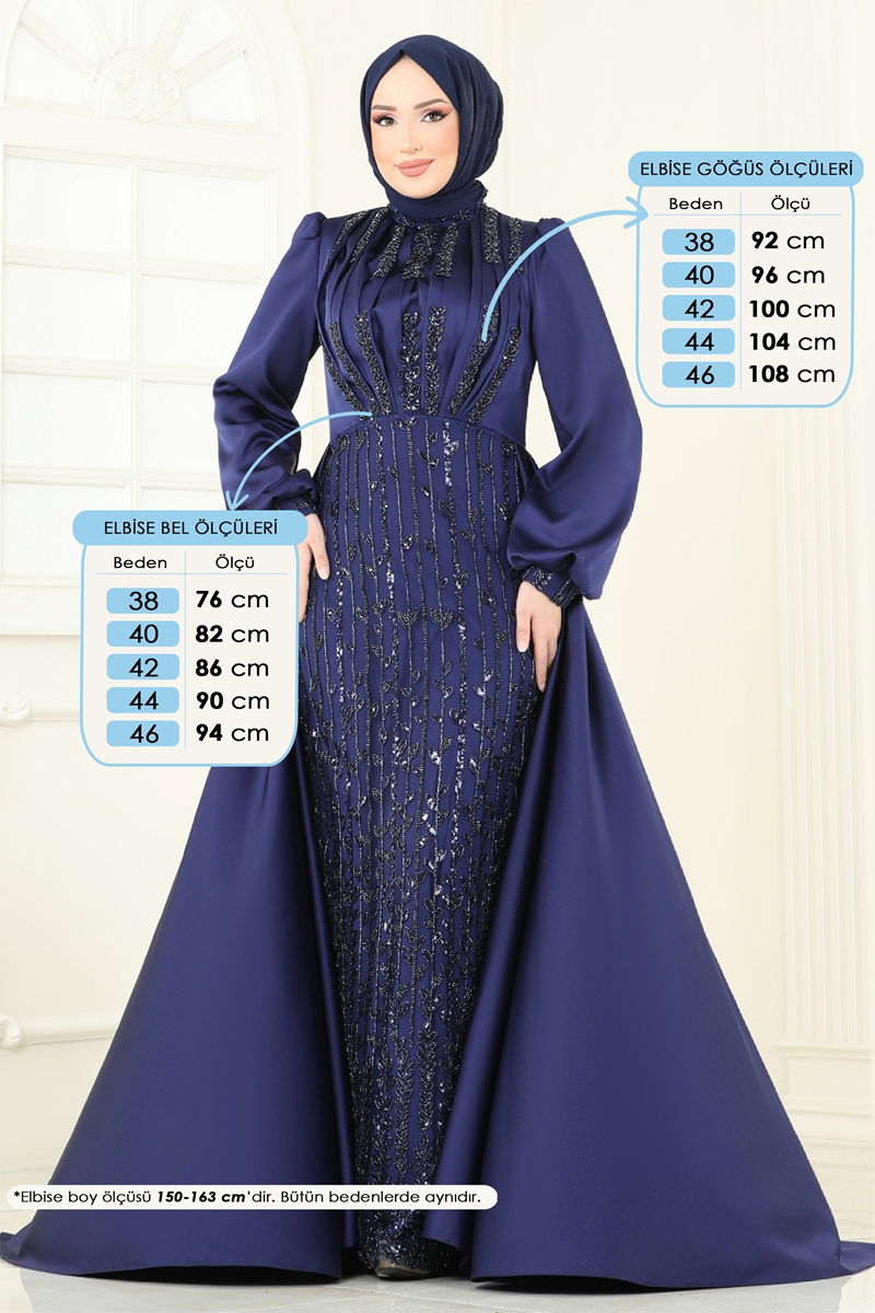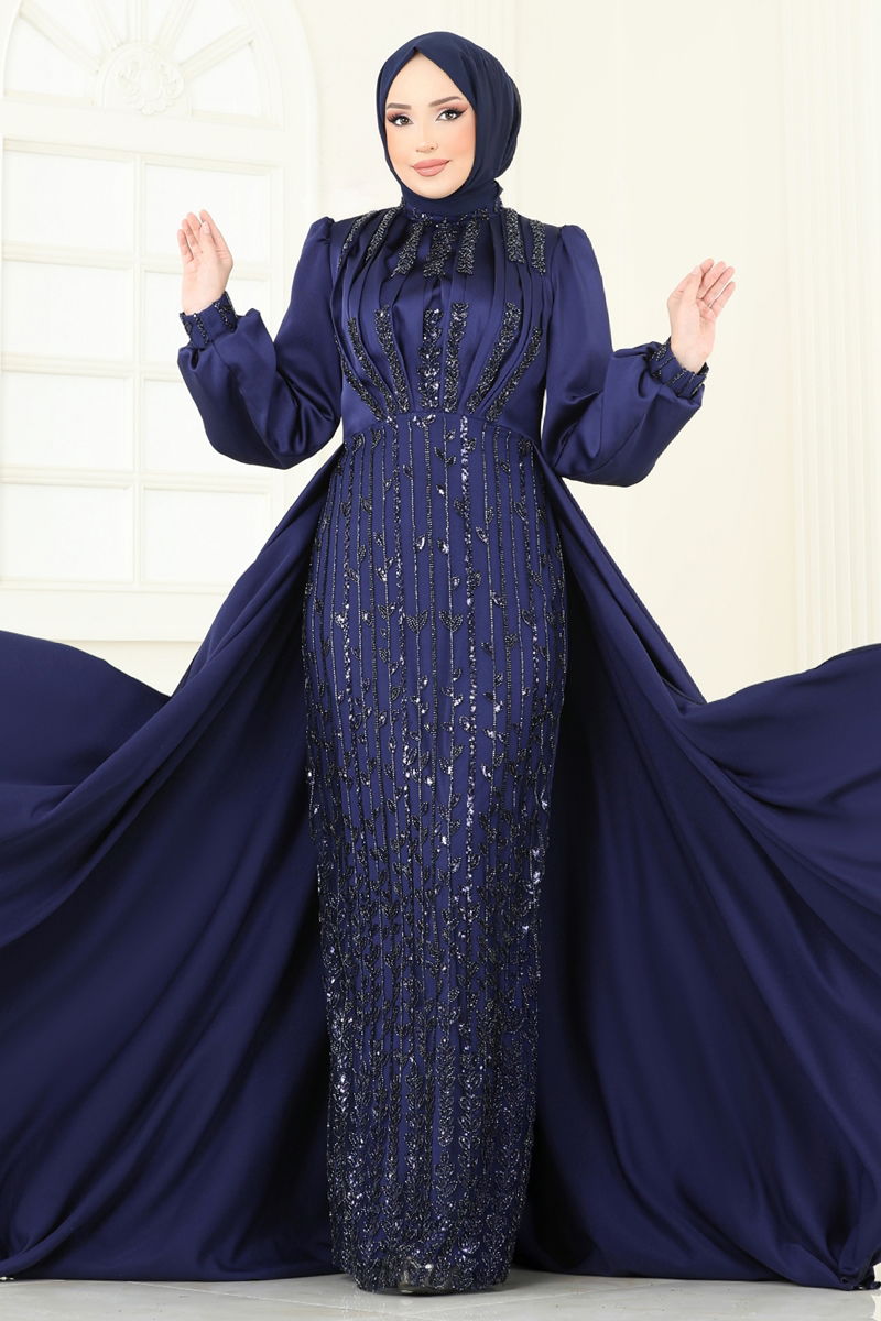 SUAL Draped Cape Evening Dress is a hijab-style product. It can be used in all four seasons. Only dry cleaning is required. Made of jeweled satin fabric. The product has a mandarin collar. It is lined. The product has a back zipper. (The product on the model is size 38.) The sequin detail is sewn. Bead details are riveted. The chiffon cape detail is sewn.