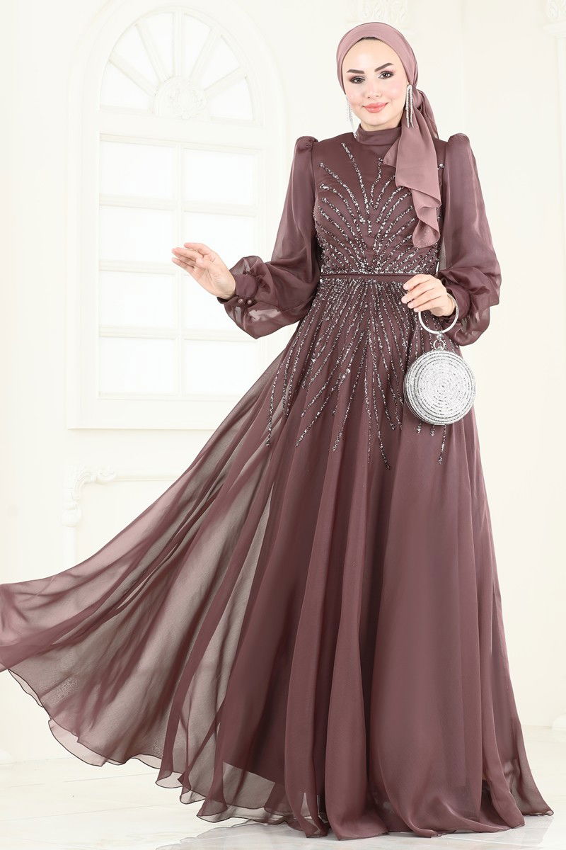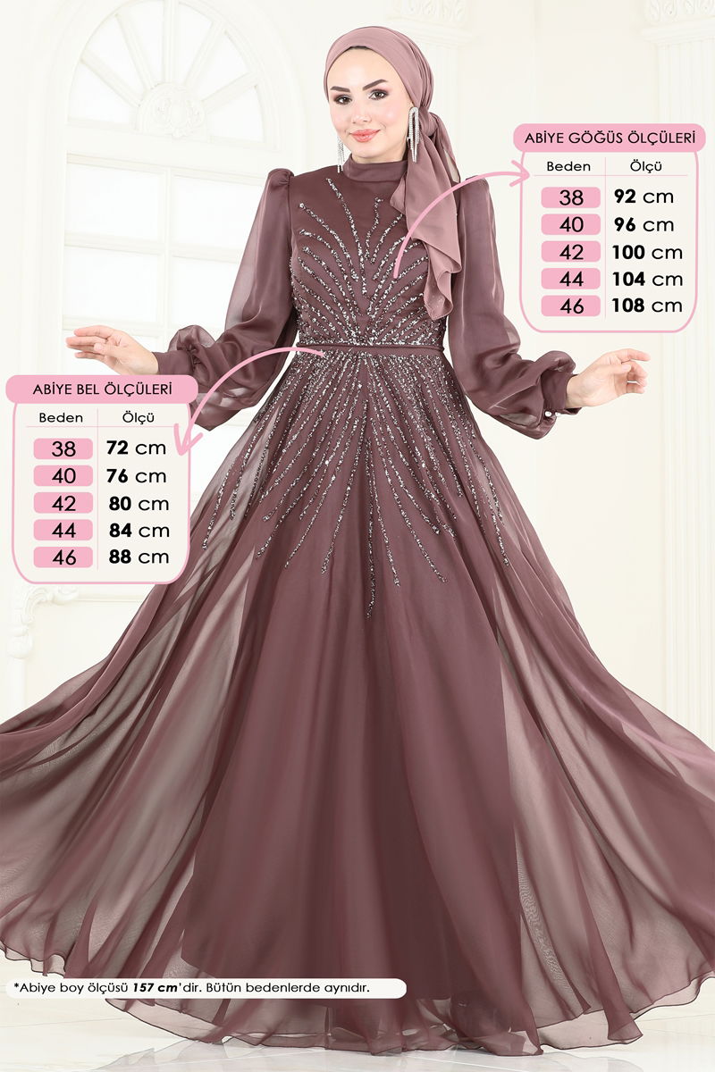 SUAL Stone Detailed Janjan Evening Dress is a seasonal hijab product that can be used throughout the year. Dry cleaning is recommended and it is made of janjan chiffon fabric. The product has a dominant collar and is lined. It has a zipper on the back. (The product on the model is size 38.) Height: 160 cm, Chest: 86 cm, Waist: 68 cm, Hip: 95 cm, Weight: 55 kg. The stones are pasted and cuff buttons are active.