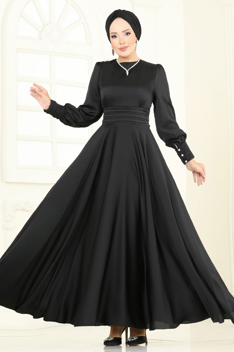 Product Name: Belt Detailed Evening Dress. This stylish hijab evening dress is made from Kobe and Satin fabrics and can be comfortably worn in all seasons. With its bicycle collar and lining-free design, it offers a modern look, while the zipper in the back and stitched waist provide ease of use. Hand washing is recommended. The product displayed is size 38, the belt is sewn to the product, and the cuff buttons are functional, making it an ideal choice for those who do not want to compromise on elegance.Evening Dress SIZE DIMENSIONS (CM)Size Chest Length 38 92 143 40 96 143 42 100 143 44 104 143 46 108 143 48 112 143 Weight (Kg):0.75 -
