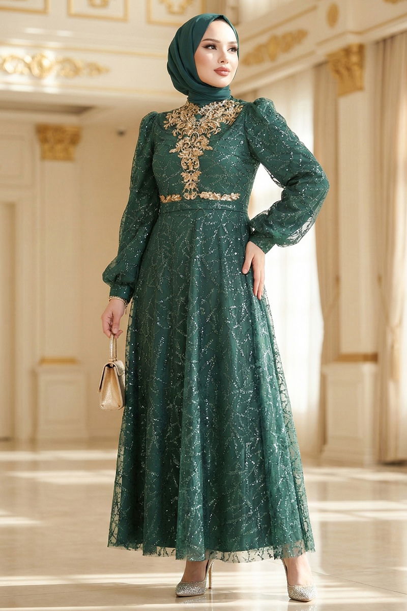 The Sequined Tulle Evening Dress is an elegant option for modest fashion. Suitable for year-round wear, this piece stands out with its sparkling tulle fabric and crew neck. Embroidered sequin details and an included, adjustable belt make this dress unique. Only dry cleaning is required for this lined dress, which is also equipped with a zipper at the back for easy wear. (The product model is wearing size 38.)