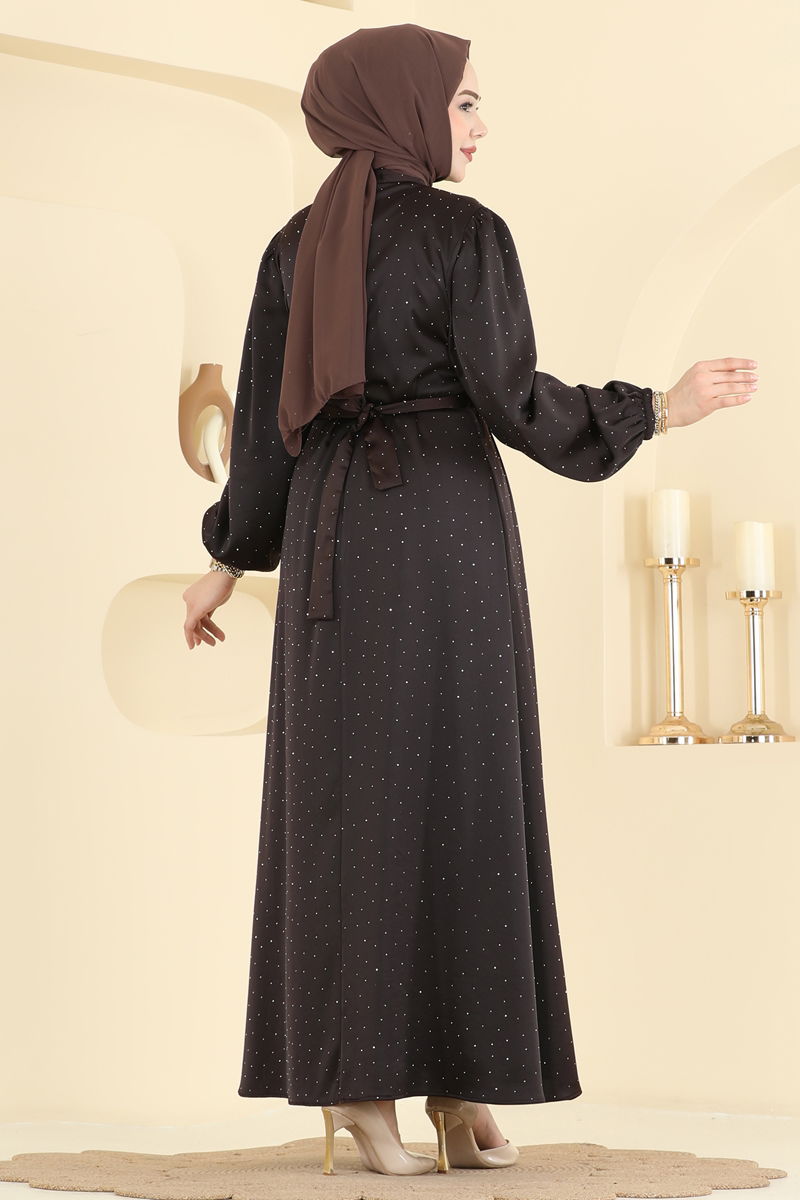 The Elegant Belted Satin Gown stands out in the world of modest fashion. Suitable for all seasons, this special design achieves an elegant look with gemstone-embellished satin fabric. Featuring a semi-high collar and a zipper at the back, this gown offers a light and comfortable wear without linings. The meticulous tailoring ensures that the belt stays smooth without waviness, and the elasticated cuffs provide ease of use. This dry-clean-only piece will dazzle on your special occasions.