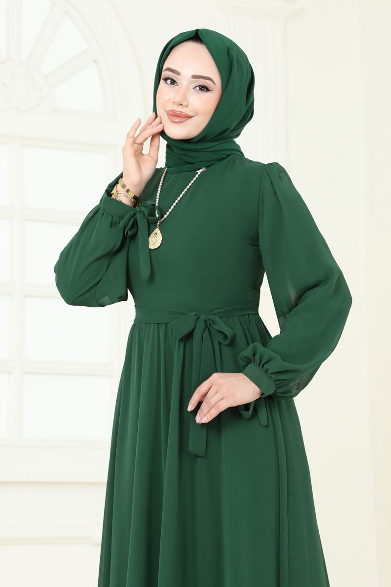 The Cuff-Laced Evening Dress is an elegant option within the modest wear category. Suitable for all seasons, this dress should be dry cleaned only. Made from chiffon, it features a mandarin collar and is lined for comfort. The back zipper facilitates easy wear, and the belt design prevents sagging, although its use is optional. The cuffed laces complete the chic look of this evening dress, making it perfect for every special occasion.