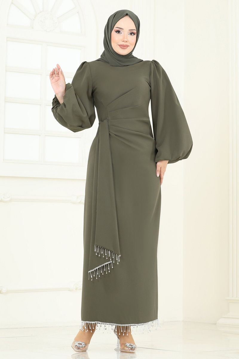 Product Feature : It is a new season hijab fashion product. It has a belt that can be fastened from the side. The product has a Cycling collar. Unlined. The product has a zipper at the from the back part. Stone details are erected. Belt is sewn to the product. Balloon sleeves. There may be a tonal difference in the product due to concept photo shoots.