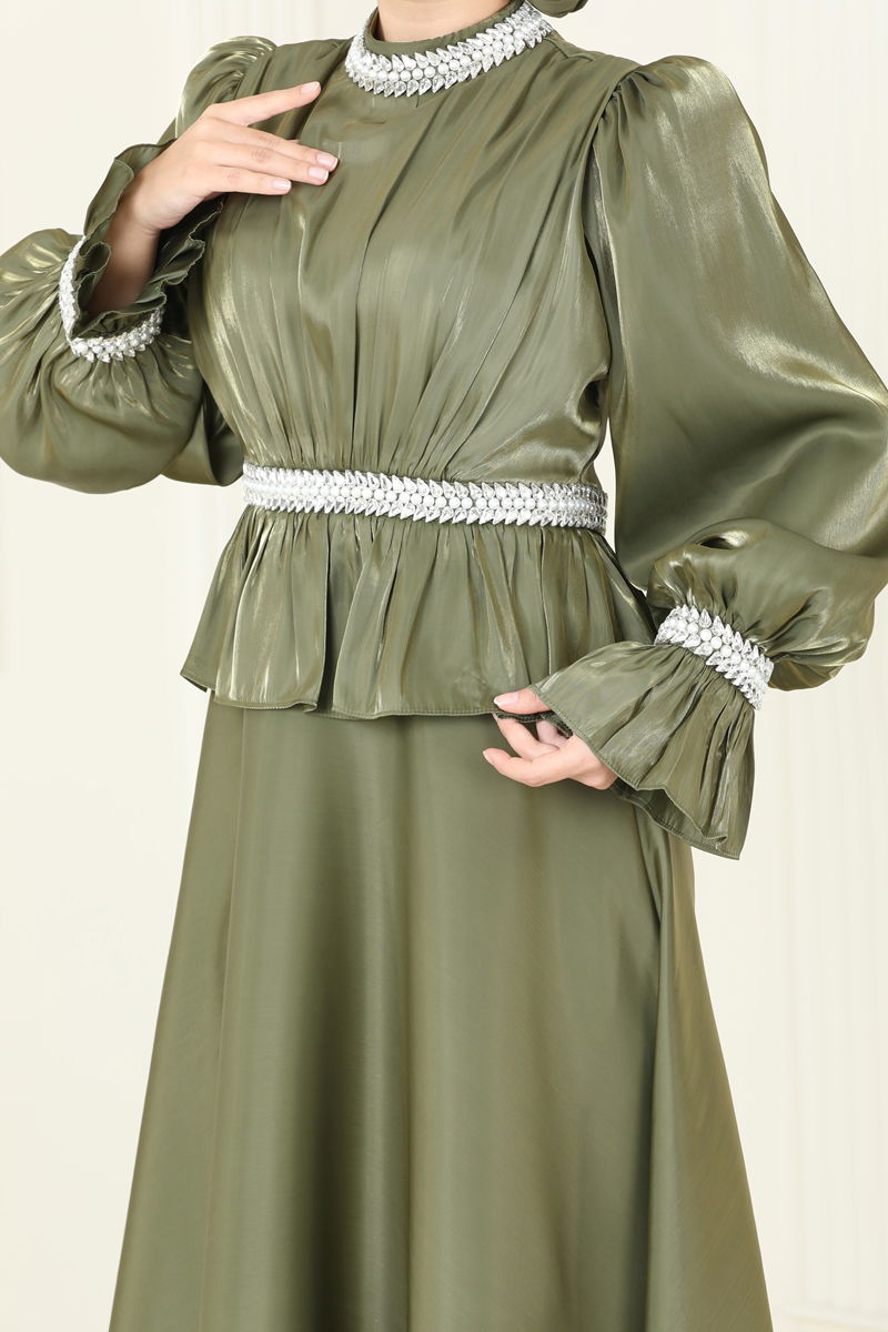 Exuding elegance and sophistication, the Stone Embellished Organza Evening Dress is specifically designed for veiled women. Suitable for all seasons, this dress should only be dry cleaned. Made of organza fabric, it offers comfort and elegance with its half-mandarin collar and lined design. The zipper at the back provides ease of use, while the stitched waist and glued stone details add a captivating appeal. The product is represented in a size 38 model.