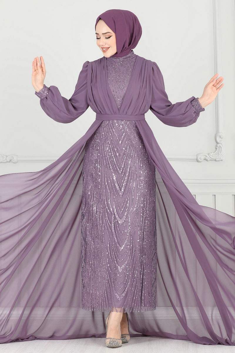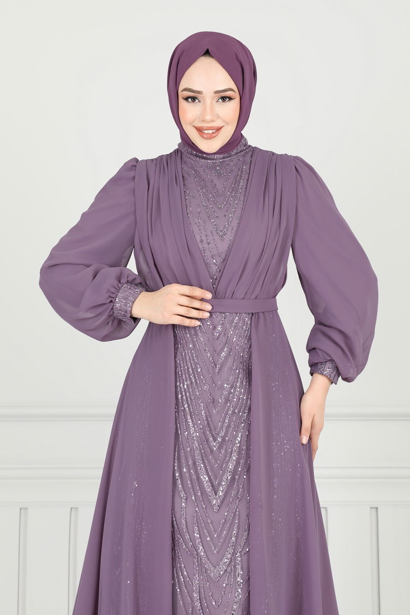 Elegant Sequined Cape Evening Gown designed to maintain your stylish look across all seasons. This special design can only be dry cleaned, combining elegant chiffon fabric with sequins for a graceful appearance. Its demi Mandarin collar and lined structure increase comfort, while the zippered back design allows for easy wear. The seam detail at the waist of the model additionally sketches a chic silhouette. This modest wear gown is ideal for dazzling on every special occasion.