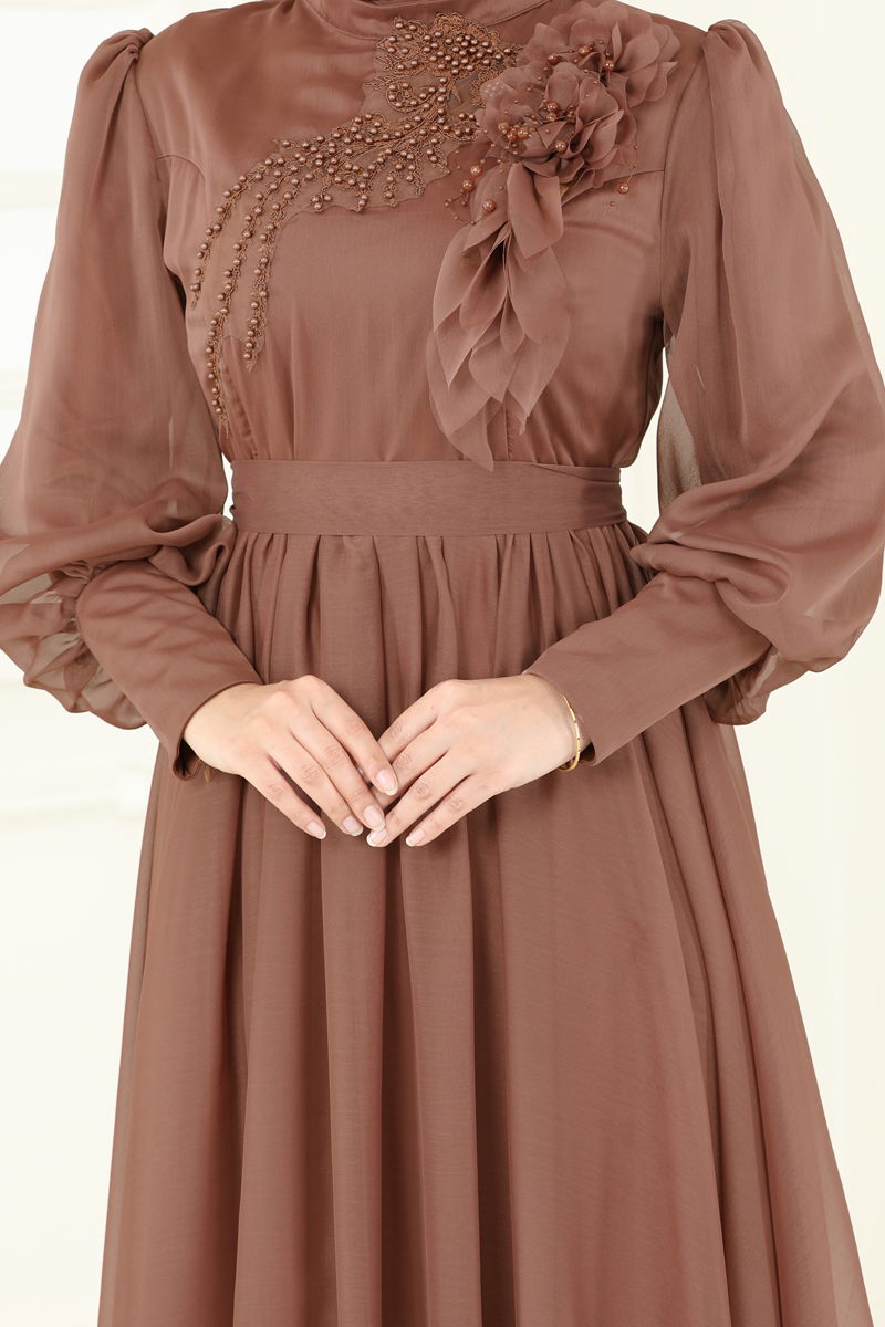 The Pearl Detail Janjan Evening Dress is a modest wear model and can be worn throughout all seasons. It should only be dry cleaned and is made from Janjan fabric. Featuring a mandarin collar and lined design, it offers a zipper at the back. The dress glimmers with lace and pearl details, has a stitched waist, and includes a belt that may optionally be omitted. The cuffs are zippered, and the belt is designed with stitched ends to prevent waviness. (Displayed model is size 38. Height: 165 cm, Chest: 80 cm, Waist: 68 cm, Hips: 96 cm, Weight: 54 kg.)