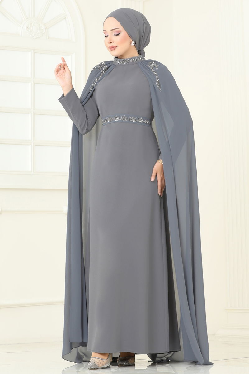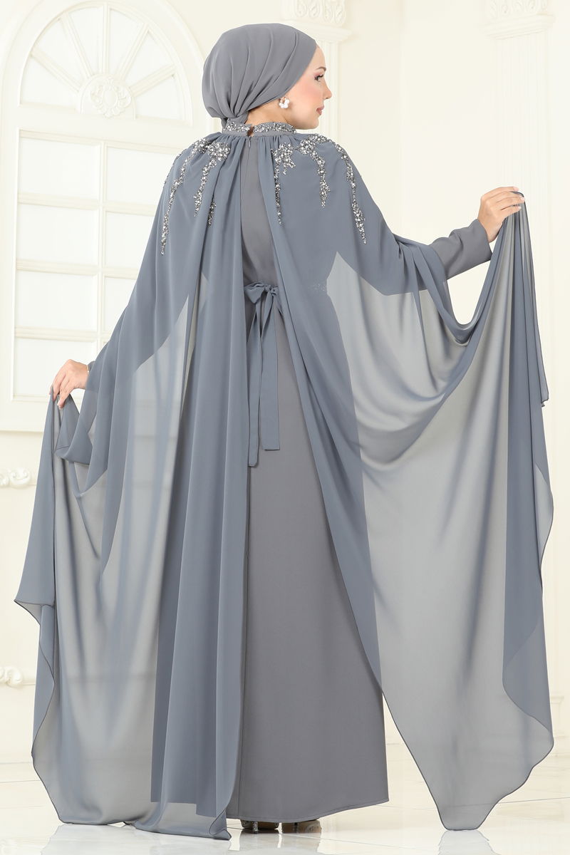 Stone Detailed Chiffon Cape Muslim Evening Dress offers versatility for all seasons. The carefully selected crepe fabric combines comfort and elegance, while the chiffon cape adds an extra flair. Featuring a semi-High neck design, this garment stands out with a modern look and is recommended for dry cleaning only. The zipper at the back and the sparkling details of beads and stones make this dress breathtaking. The belt design maintains its form when worn and can be optionally removed. This unique design will make you stand out at every special occasion.