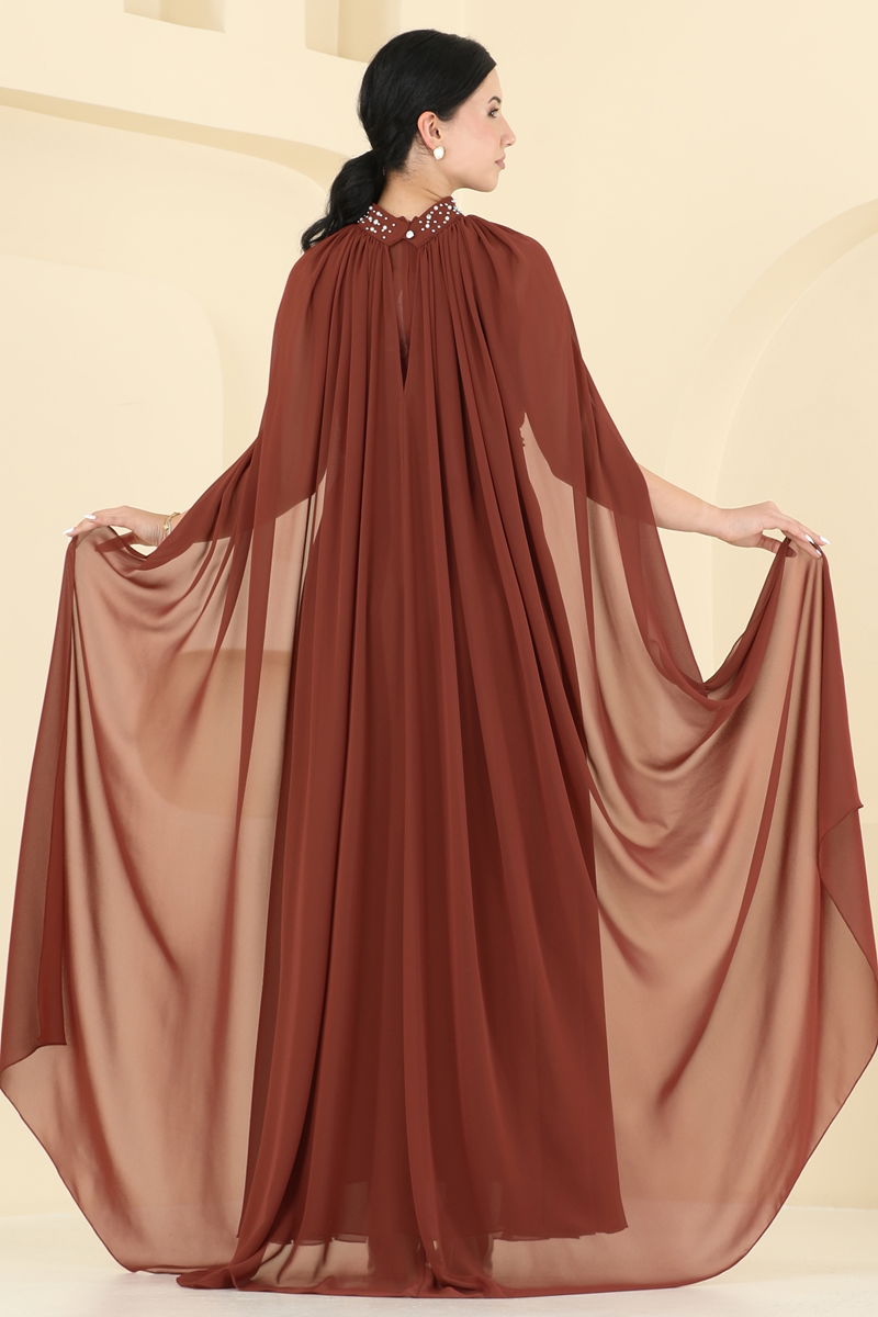 Product Feature : It is a new season hijab fashion product. It has a button that can be used from the back. The product has a Cycling collar. It is lined. The product has a zipper at the from the back part. The product includes a breast pad. The pearls are pebbles and the stones are glued. The product has a stitched waistband. Cloak included, optional not available. There may be a tonal difference in the product due to concept photo shoots.