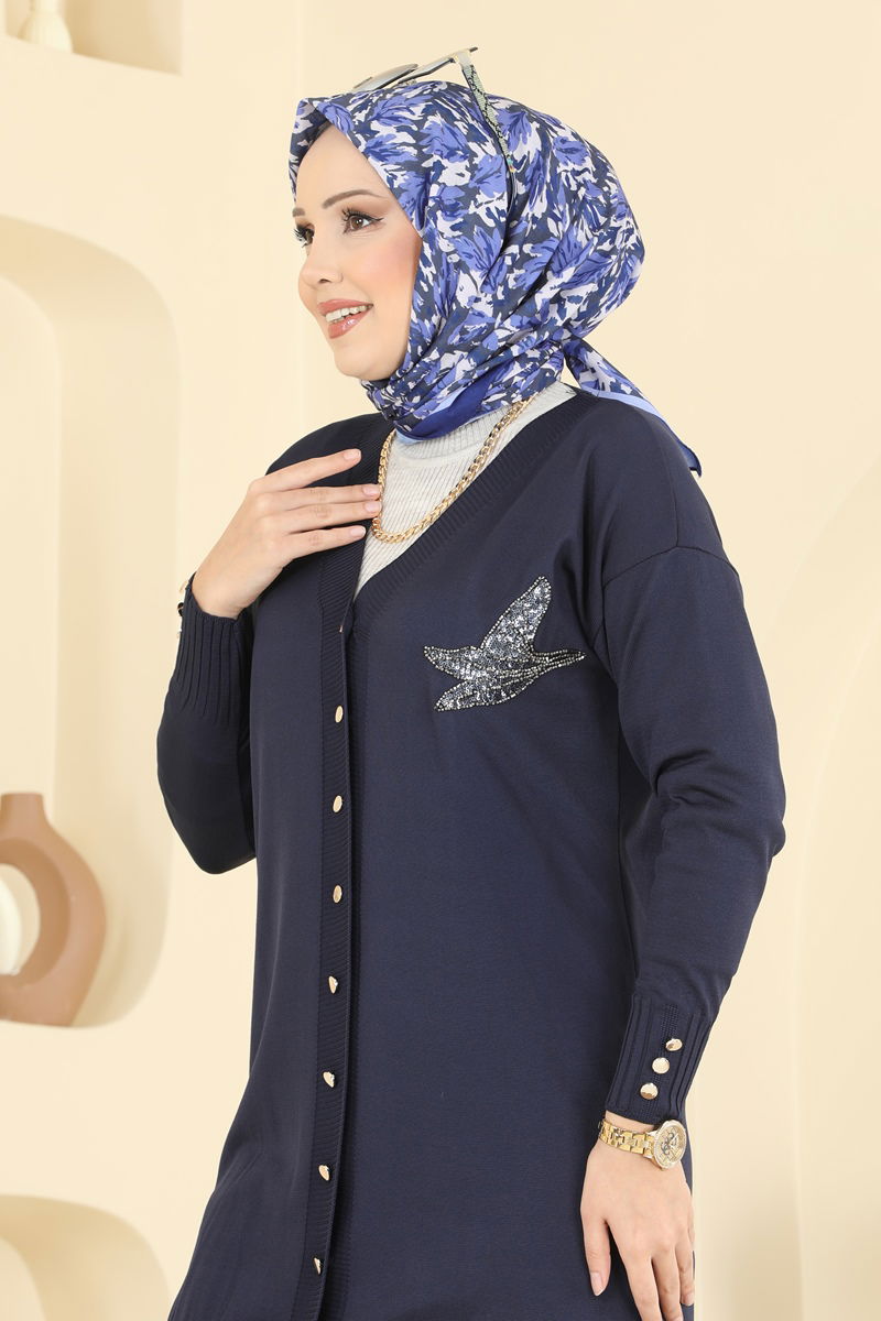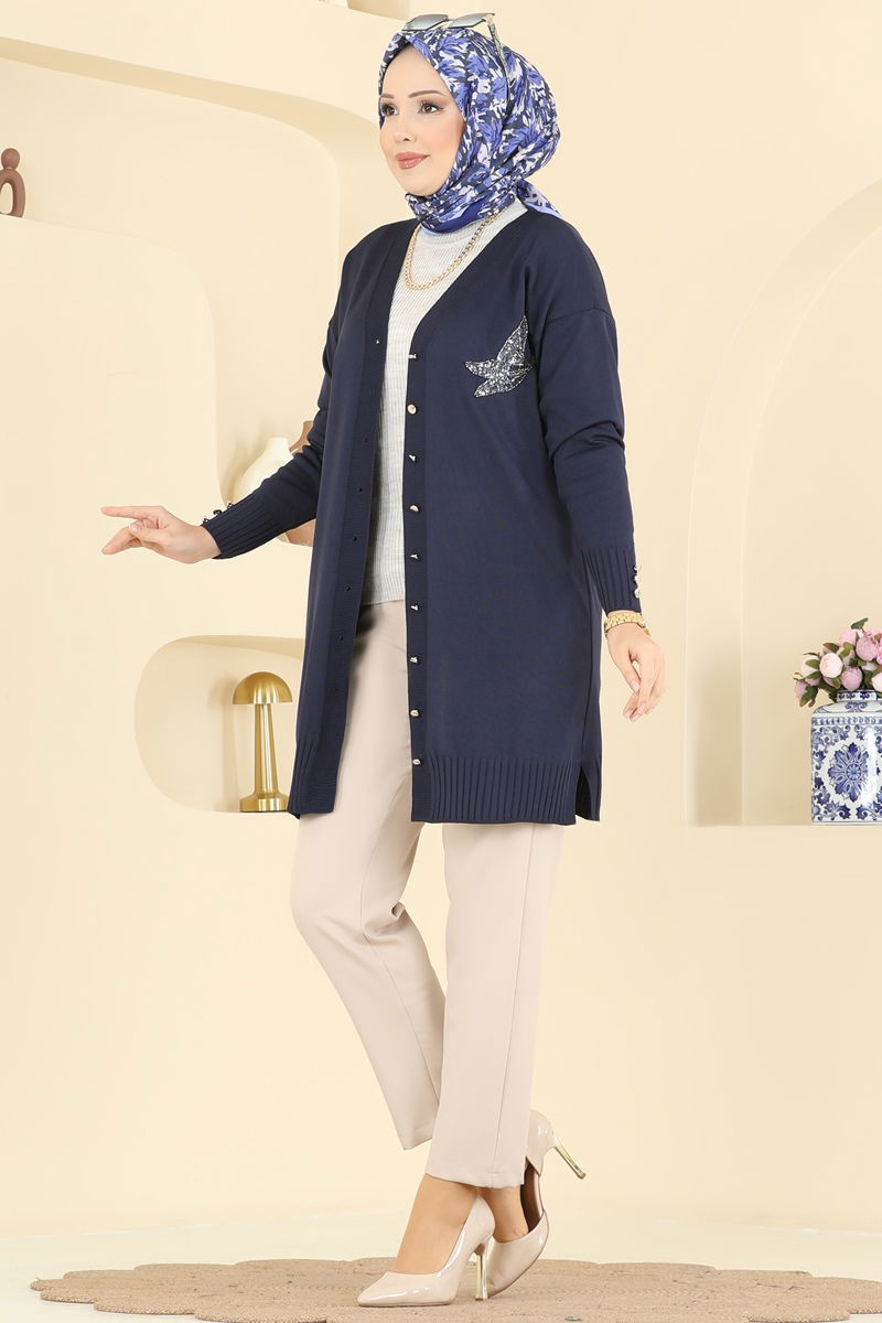 Desenli Triko Hırka, tesettür giyim için özel olarak dizayn edilmiştir ve sonbahar ile kış aylarındaki stilinizi tamamlar. Hassas merserize triko kumaşından üretilmiş ve 30 derecede yıkamaya uygun bu ürün, klasiğe dönük V yakası, ön kısmı düğmeli yapıda ve astarsızdır. 36, 38, 40 ve 42 olmak üzere standart bedenlere uygun yapıdadır. Kollarındaki düğme gibi süs detayları ile de şıklığınızı artırır.