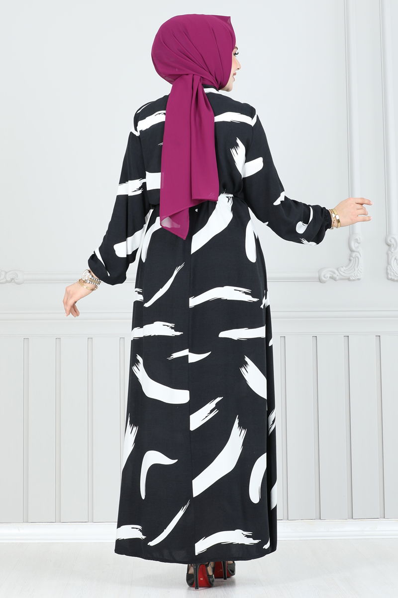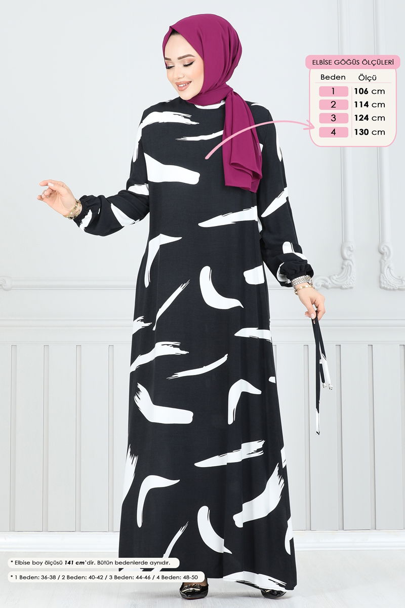 Fırça Desen Viskon Elbise 800OZN1046-MS Siyah