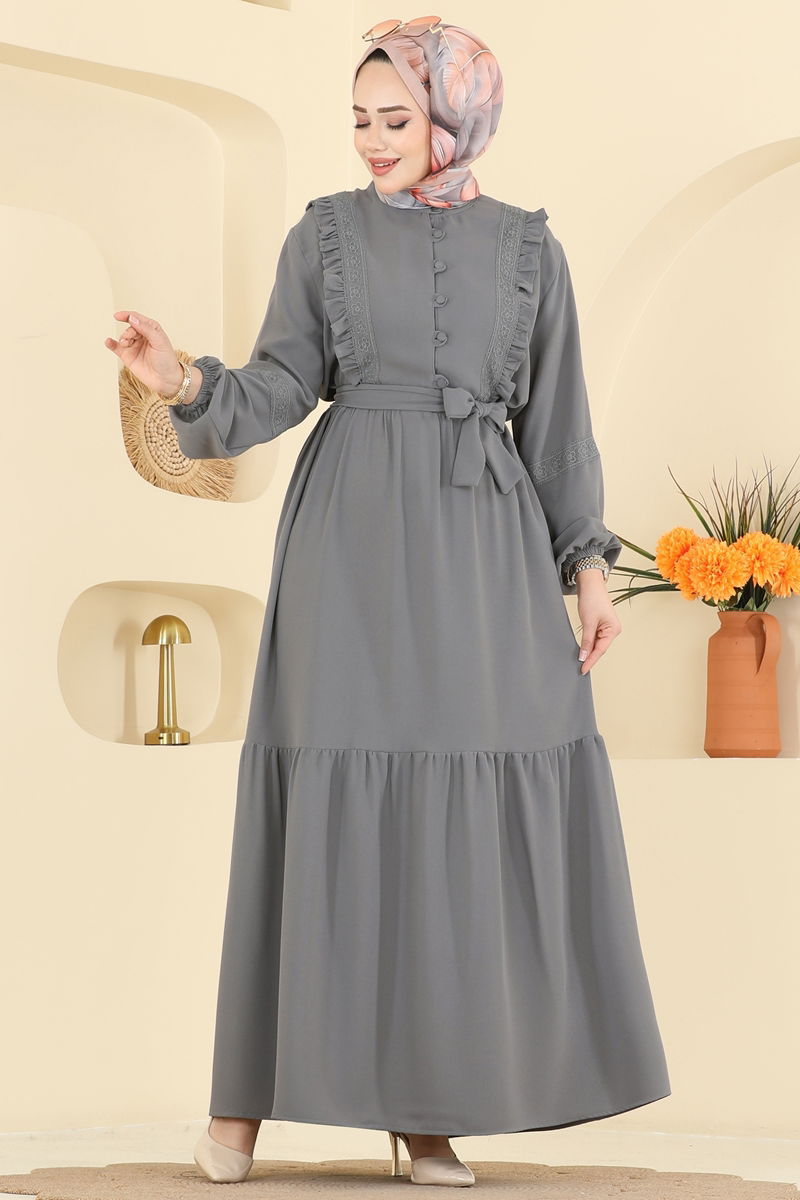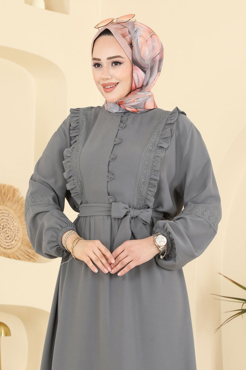 Fırfır Detaylı Krep Elbise 318ASN888-MS Gri