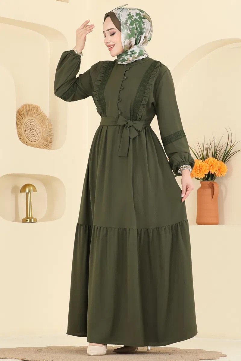 Fırfır Detaylı Krep Elbise 318ASN888-MS Haki