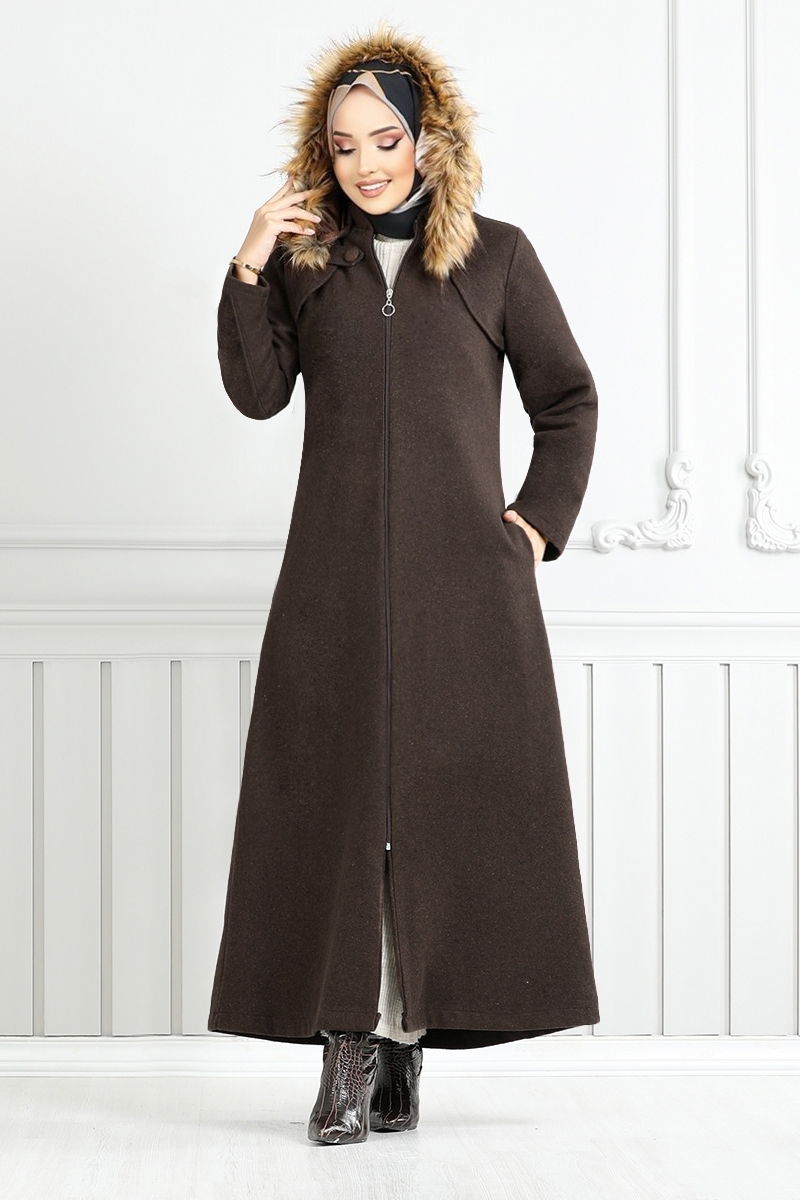 Front Zipper Cachet Coat KahveKumaş Feature: It is made of cachet fabric. It can be used in Autumn and Winter season.Product Feature: New season hijab is a fashion product. The product is a Hooded collar. It is unlined. The product is zipped from the front. Fur is sewn to the product. The hood is included in the product, it may not be used on request. Pocket is available. There may be a tonal difference in the product due to concept photo shoots.Washing : IT CAN BE WASHED WITHOUT TIGHTENING AT 30 DEGREES.(DELICATE WASHING)(The product on the model is size 38.) Product Length : 132 Cmmanken Dimensions : Height : 1.67 (Without Shoes)Chest: 80Bel :68Basen :96NOTE: The product mold is a one-to-one mold and it is recommended to order your own size.The Cachet Coat with Front Zipper is a model hijab product. It can be used in Autumn and Winter season. IT CAN BE WASHED AT 30 DEGREES WITHOUT TIGHTENING.(PRECISION WASHING) It is made of cachet fabric. The product is a Hooded collar. It is unlined. The product is zipped from the front. (The product on the model is a size 38.) The fur is sewn to the product. The hood is included in the product, it may not be used on request. Pocket is available.