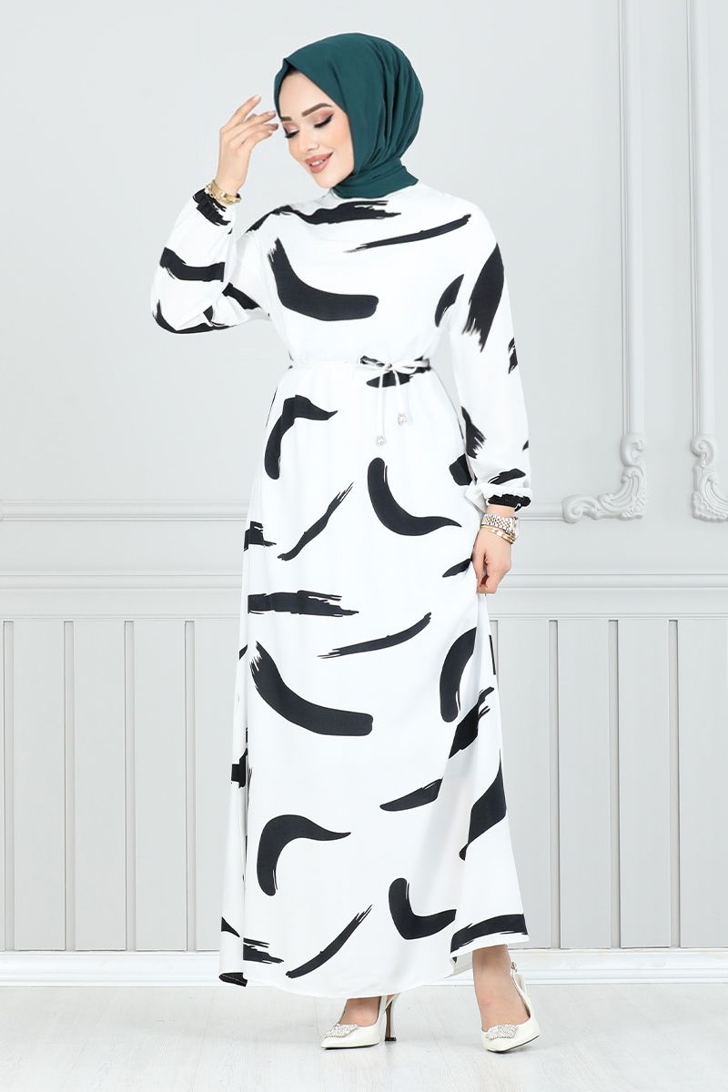 Desenli Viskon Elbise 800OZR1047-M Ekru