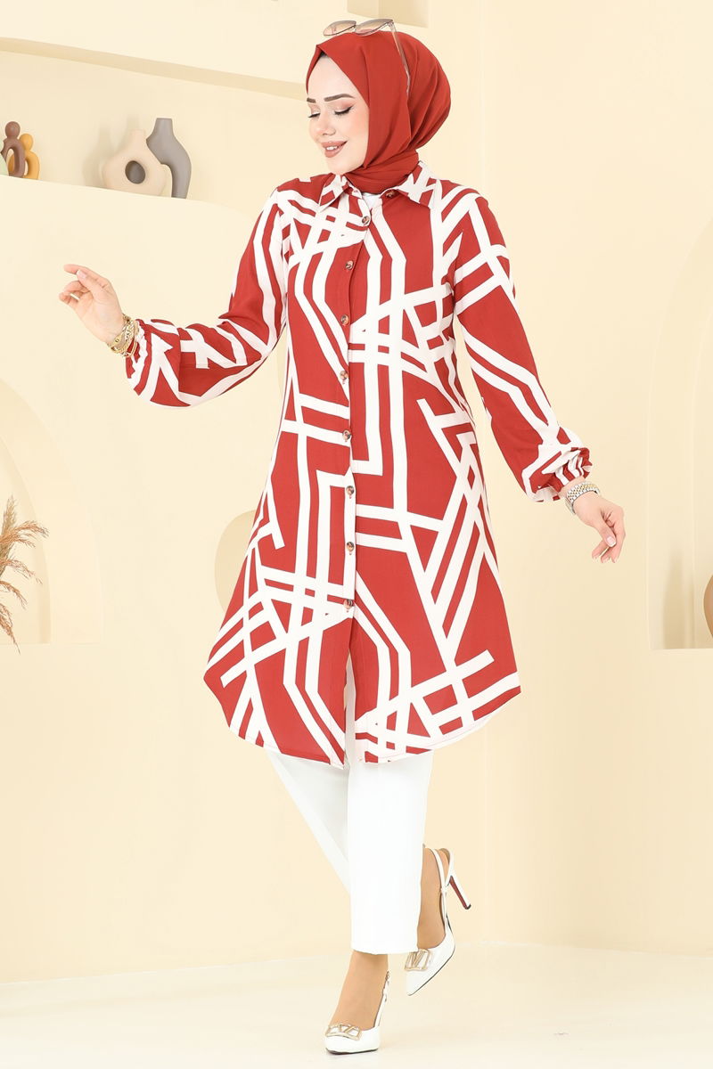 Geometrik Desen Viskon Tunik 0173BG354-MS Kırmızı&Ekru
