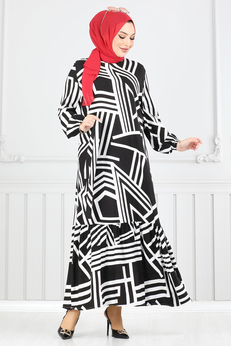 Siyah Viskon Geometrik Desenli Elbise