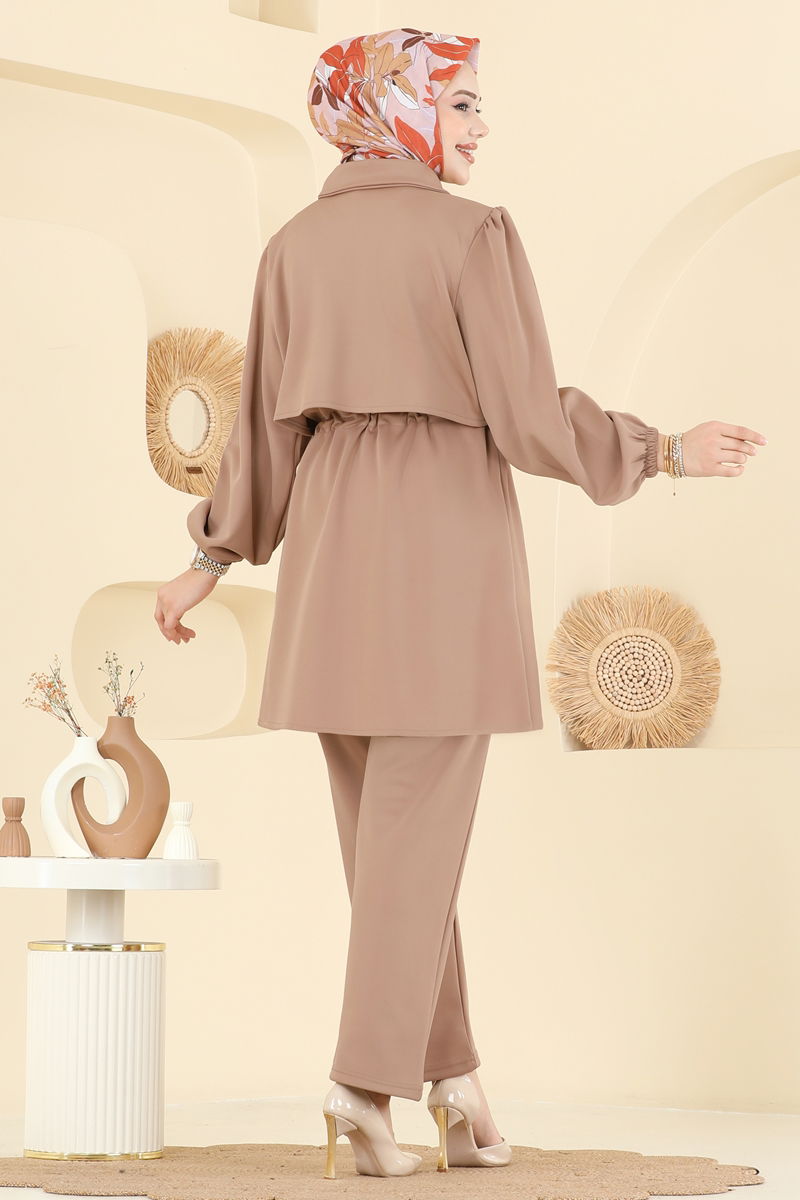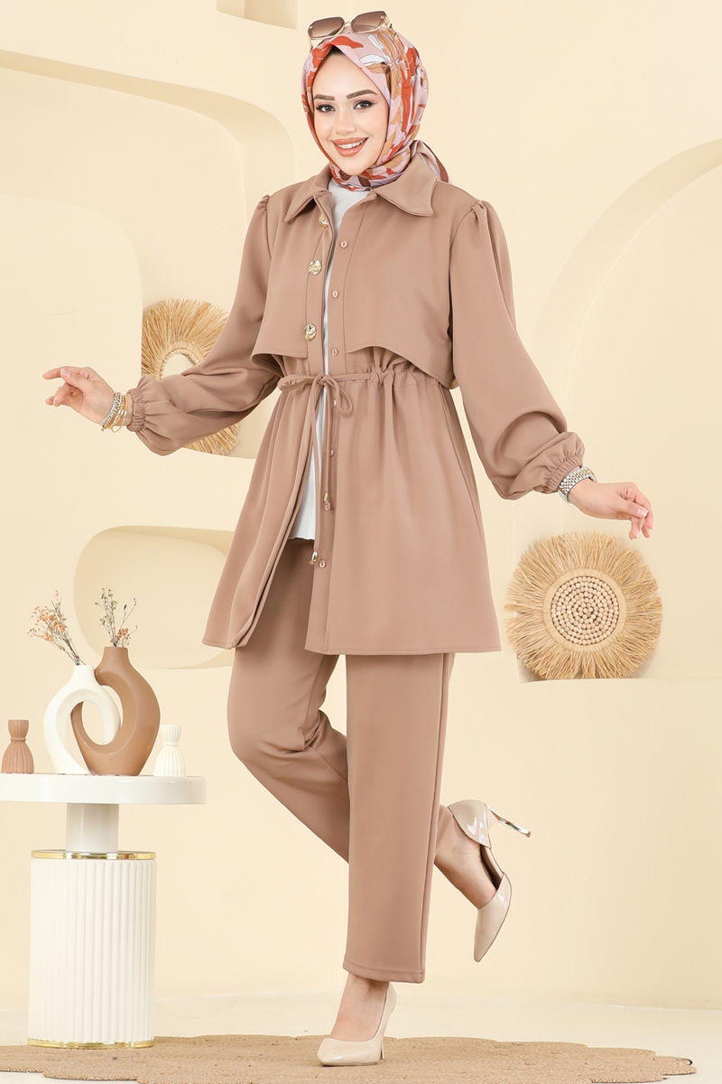 Ürün Detayı : Yeni sezon tesettür giyim ürünüdür. Bel kısmında bağcıklar bulunur. Gömlek tipi yaka ve gizli düğmeler mevcuttur. Astar bulunmamaktadır. Pantolonun beli esnektir. Pantolonun manşetleri lastiklidir.Renk tonlarında çekimlerden ötürü farklılık olabilir.