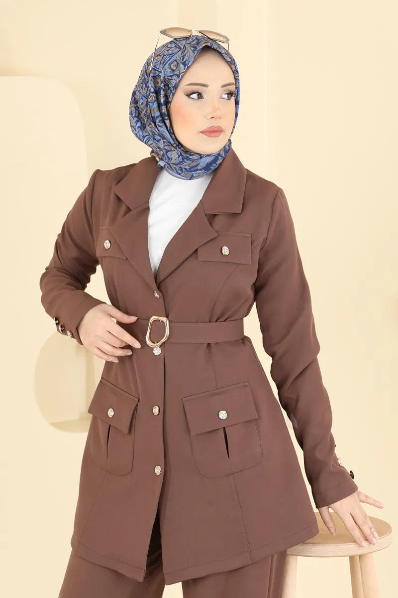 Ürün Detayları : Modern tesettür moda ürünüdür. Ceketin yaka tasarımı düzdür. Ön kısmı düğmeli ve astarsızdır. Göğüs kısmında dekoratif cep bulunmaktadır. Kemer takım içinde yer almaktadır, isteğe bağlı çıkartılabilir. Hem ceket hem de pantolonda cep mevcuttur. Pantolonun beli elastiktir. Kol düğmeleri aksesuar olarak tasarlanmıştır.Fotoğraf çekimi nedeniyle renk tonlarında farklılık olabilir.