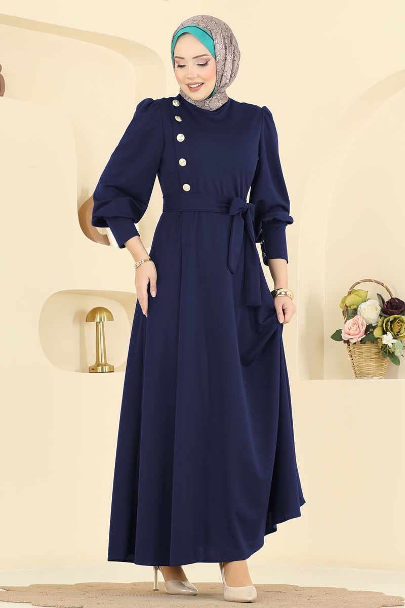 The Gold Buttoned Crepe Dress is a modest wear model that can be comfortably worn across all seasons. This dress, which can be washed at 30 degrees on a gentle cycle, is crafted from high-quality crepe fabric. It features a half mandarin collar and is unlined with a zipper at the back. The product displayed is a size 38. The waist of the dress is seamed, and the buttons are designed as accessories. The included belt is designed with ends sewn to maintain its shape during wear and can be optionally removed. The cuff buttons are active and functional.