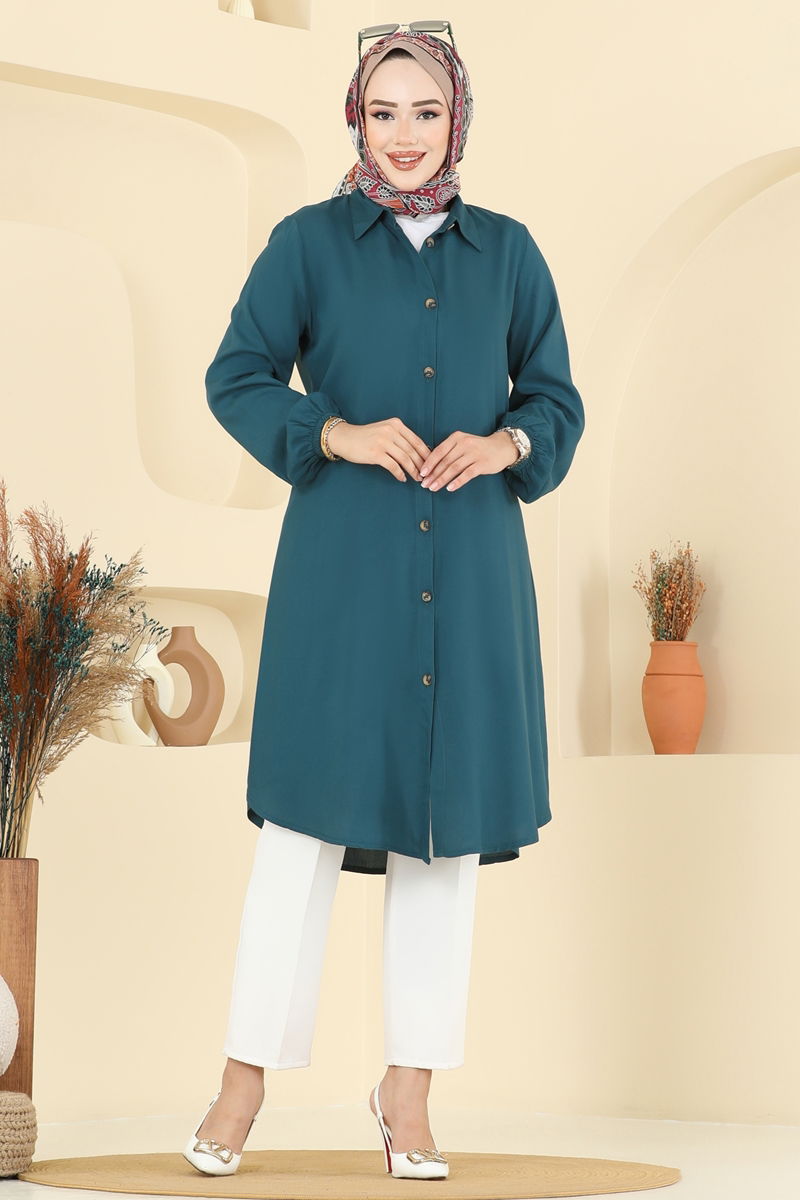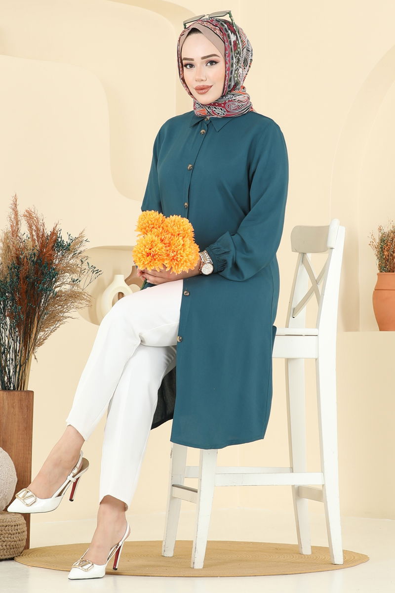The Shirt Collar Detailed Tunic is an all-season wearable hijab tunic. Washable at 30 degrees on a gentle cycle, this product is made from viscose fabric, offering softness and comfort throughout the day. The shirt collar design adds a touch of elegance, while the elastic cuffs ensure practical use. The product shown on the model is in size 38.