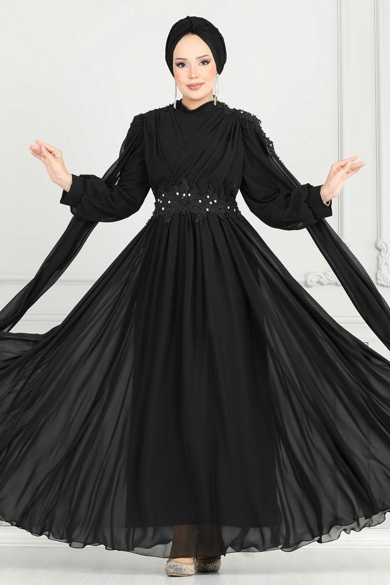 Güpür Detay Pelerinli Abiye 6640YG95-MS Siyah