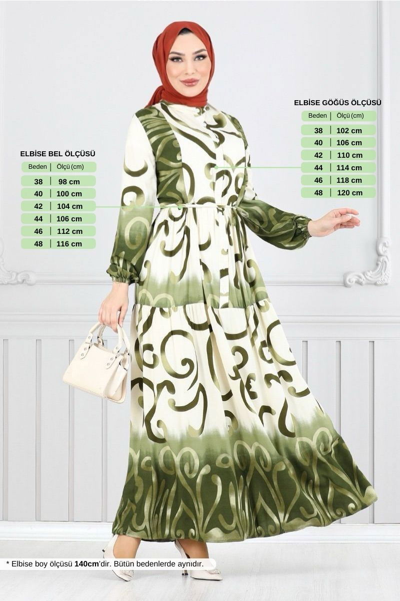 Patterned Dress with Half Buttons YeşilKumaş Feature : It is made of viscose fabric. It can be used in Four Seasonal seasons. Product Feature: New season hijab is a fashion product. The product is a Half-Judge collar. The product has a half button that can be used from the front. It is unlined. The belt is included in the product, it may not be used on request. The cuff is rubberized.There may be a tonal difference in the product due to concept photo shoots. Washing : Hand washing should be done. Belt Feature: The two ends of the belt are sewn to prevent the belt from fluctuating, the middle part is left empty (seamless). (The item on the model is size 38.)Weight (Kg):0.47