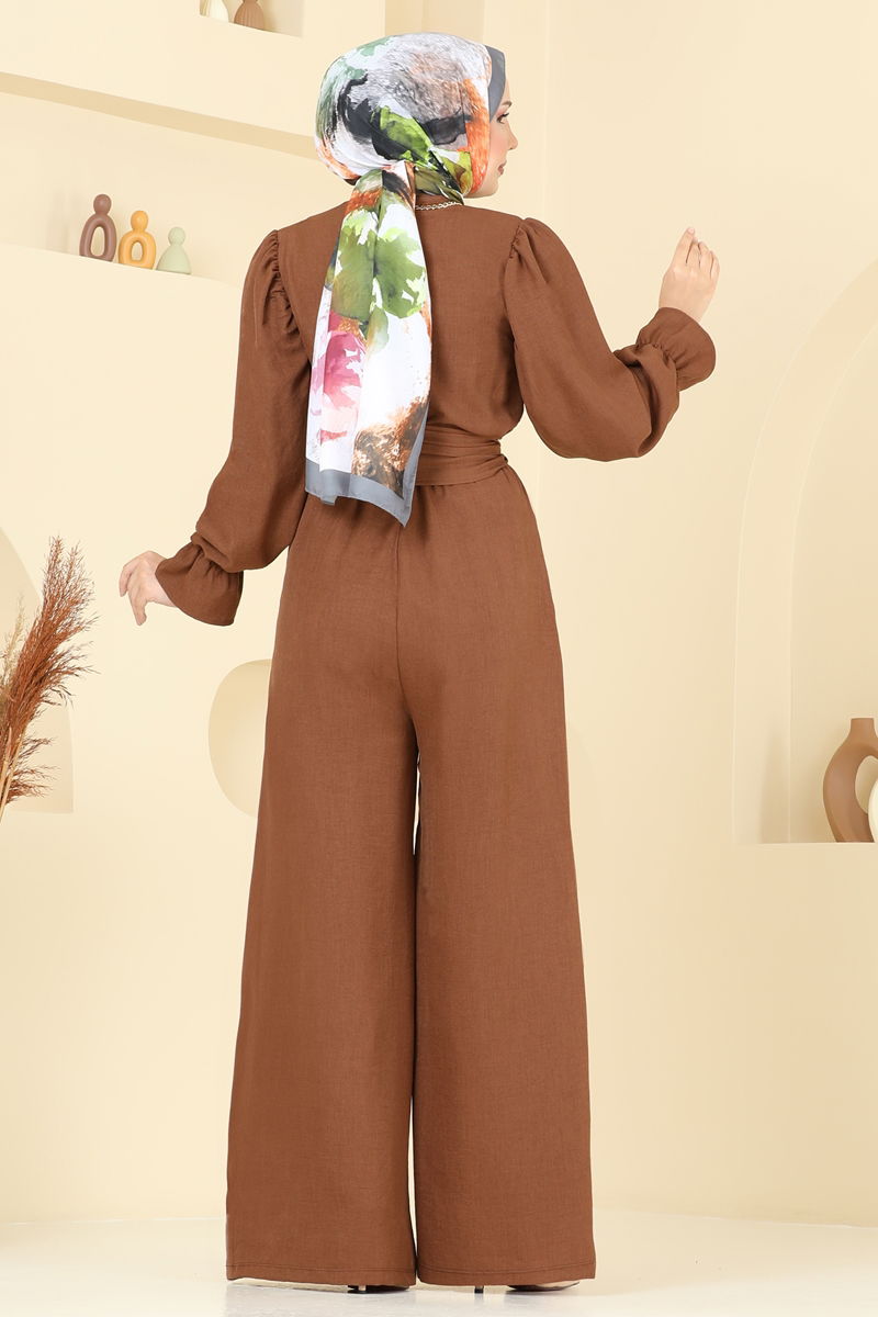The Belted Sofia Linen Jumpsuit is a modest wear suitable for all seasons, crafted from special Sofia linen fabric which offers comfort even on warm summer days. This jumpsuit can be cleaned with gentle washing at 30 degrees, ensuring ease of care. Its bicycle neck design with a zipper at the back presents a contemporary look, while the tie-able belt at the side adjusts to fit various sizes. With elastic cuffs, this piece will become an indispensable part of your wardrobe.