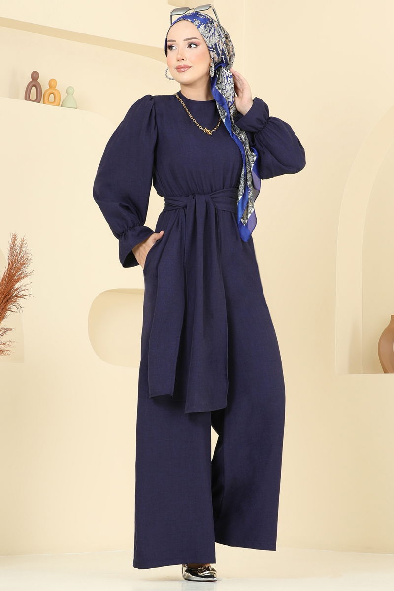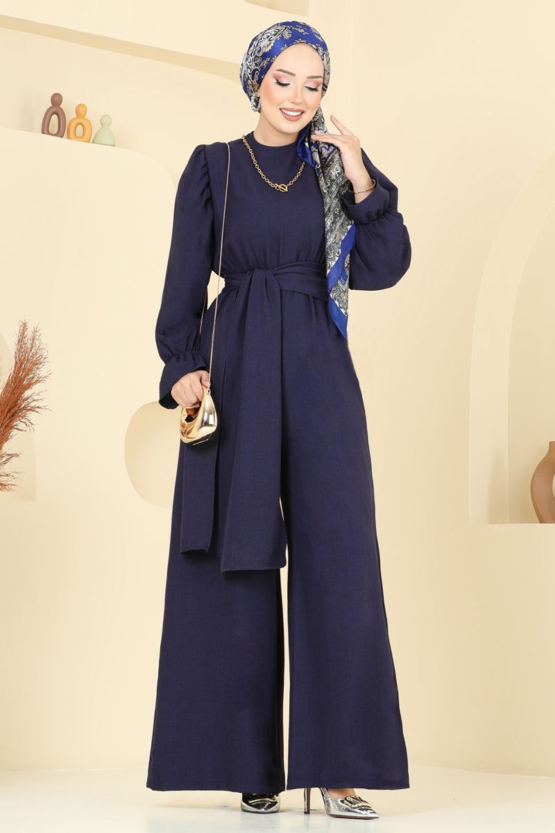 The Belted Sofia Linen Jumpsuit is a modest wear suitable for all seasons, crafted from special Sofia linen fabric which offers comfort even on warm summer days. This jumpsuit can be cleaned with gentle washing at 30 degrees, ensuring ease of care. Its bicycle neck design with a zipper at the back presents a contemporary look, while the tie-able belt at the side adjusts to fit various sizes. With elastic cuffs, this piece will become an indispensable part of your wardrobe.