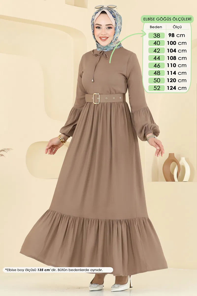 Ürün Detayları: Tesettür giyim koleksiyonunun yeni sezon ürünüdür. Bisiklet yaka özelliğine sahiptir, astarsızdır. Ürünün bel kısmında dikiş bulunmakta ve bağcıklı detaylar sadece dekoratif amaçlı kullanılmıştır. Kemer ürünle birlikte gelmekte olup, kullanımı opsionaldir. Manşetler elastik yapıdadır. Çekimlerden ötürü renk tonlarında farklılık gözlenebilir.