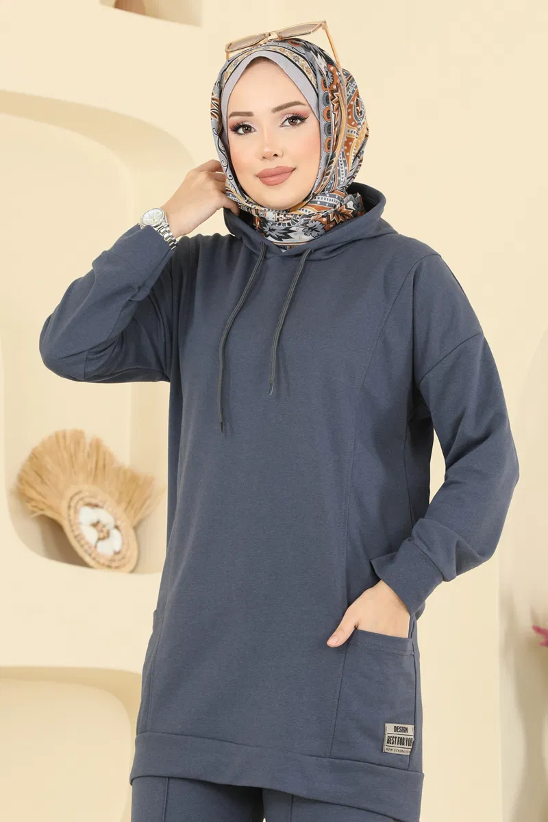 Bu rahat ve şık, kapüşonlu spor takım dört mevsim boyunca kullanılabilir özellikte olup, iki iplik kumaştan üretilmiş kaliteli ve dayanıklı bir üründür. Takım, bir tunik ve pantolon içermekte olup, 30 derece hassas yıkama ile temizlenebilir. Kapüşon detayı ile astarsız bir yapıya sahiptir. Üzerindeki takım beden 38 olup, çeşitli vücut tipleri için uygun esnek bir yapı gösterir.