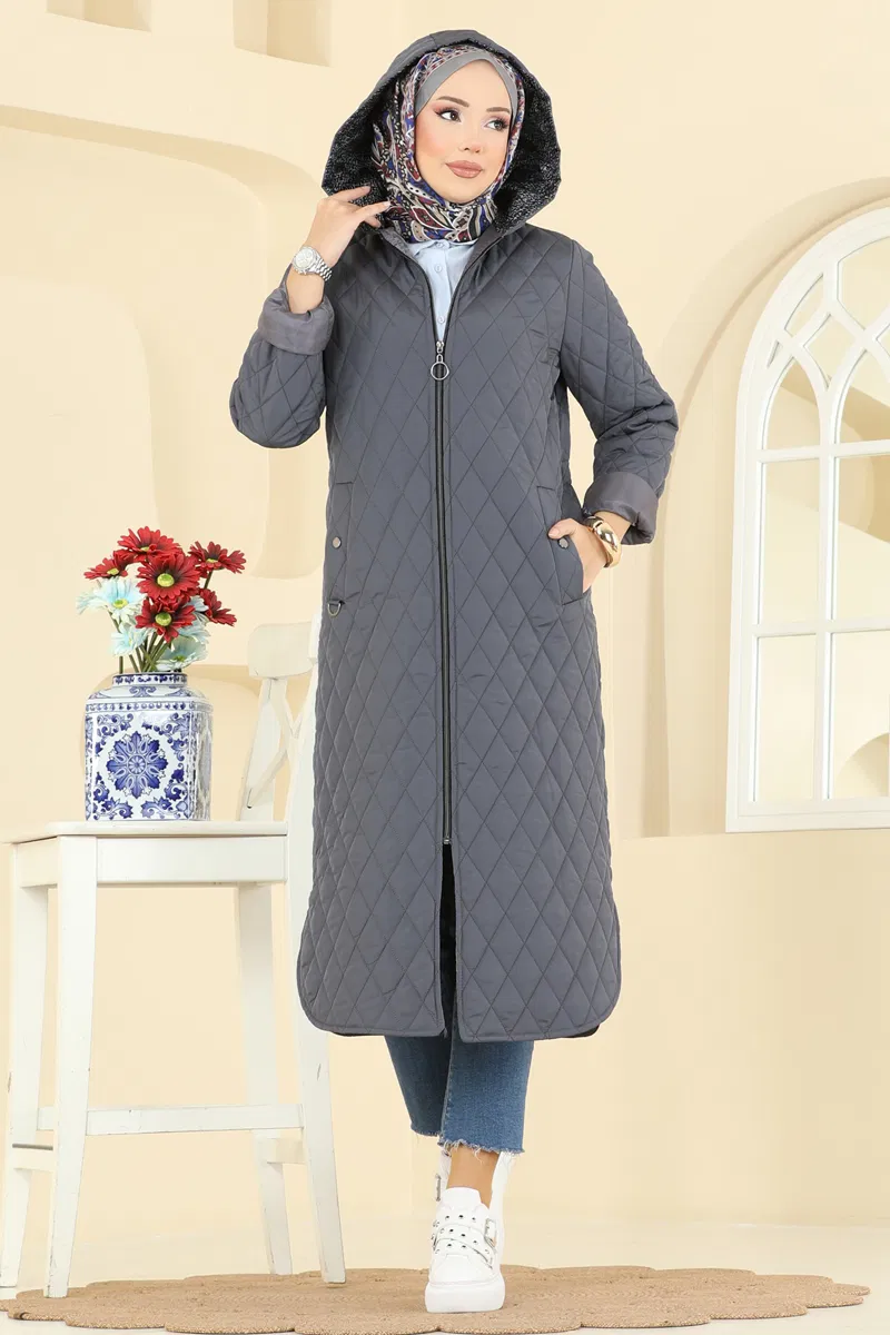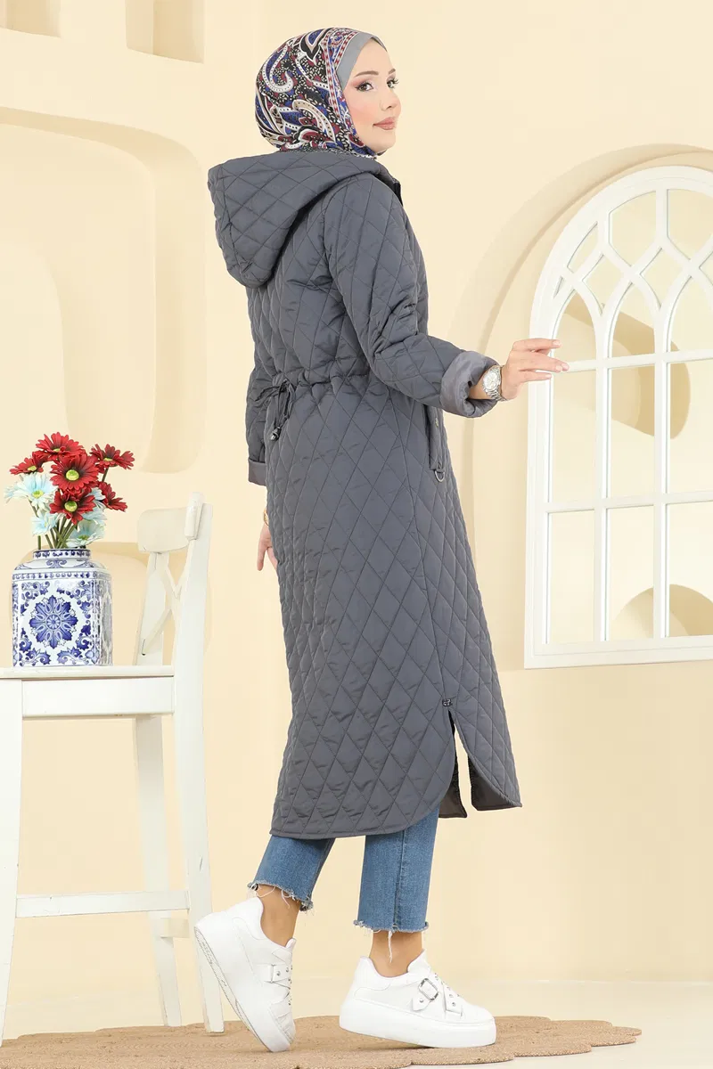 Antrasit Renk Kapitone Kapüşonlu Kaban