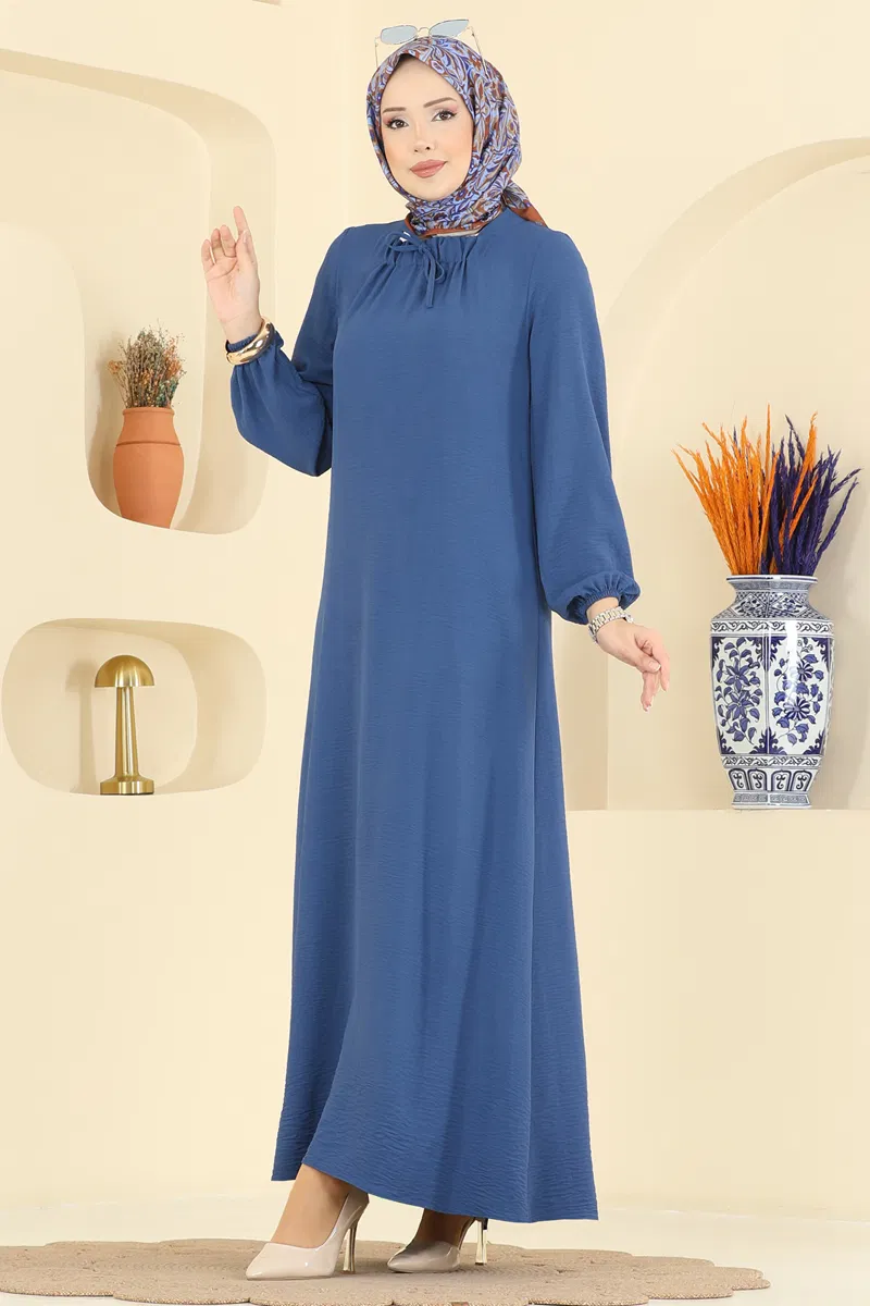 Ürün Adı: Indigo Kare Yaka Aerobin Elbise. Bu zarif tesettür elbise mevsimler arası kullanım için uygundur. 30 derecede nazikçe yıkanabilir. Kare yaka detayı modern bir stil sunar, astarsızdır ve elastik manşetlere sahiptir. Bağcıklı detaylar şıklığı pekiştirir. (Modelin giydiği ürün 38 bedendir.)