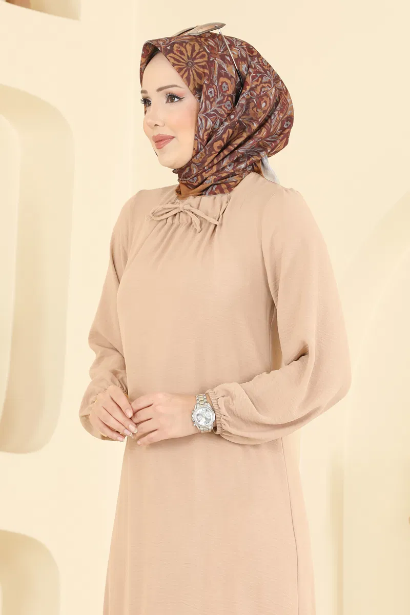 Ürün İsmi: Kare Yaka Aerobin Elbise. Bu zarif tesettür elbise, yılın her zamanı konforlu bir kullanım sunar. 30 derecede nazik yıkama programında yıkanabilir. Kare yaka detayıyla çağdaş bir stil sunar, astarsızdır ve elastik manşetlere sahiptir. Dekoratif bağcıklar ise estetik bir detay olarak dikkat çeker. (Model üzerinde sergilenen ürün 38 bedendir.)