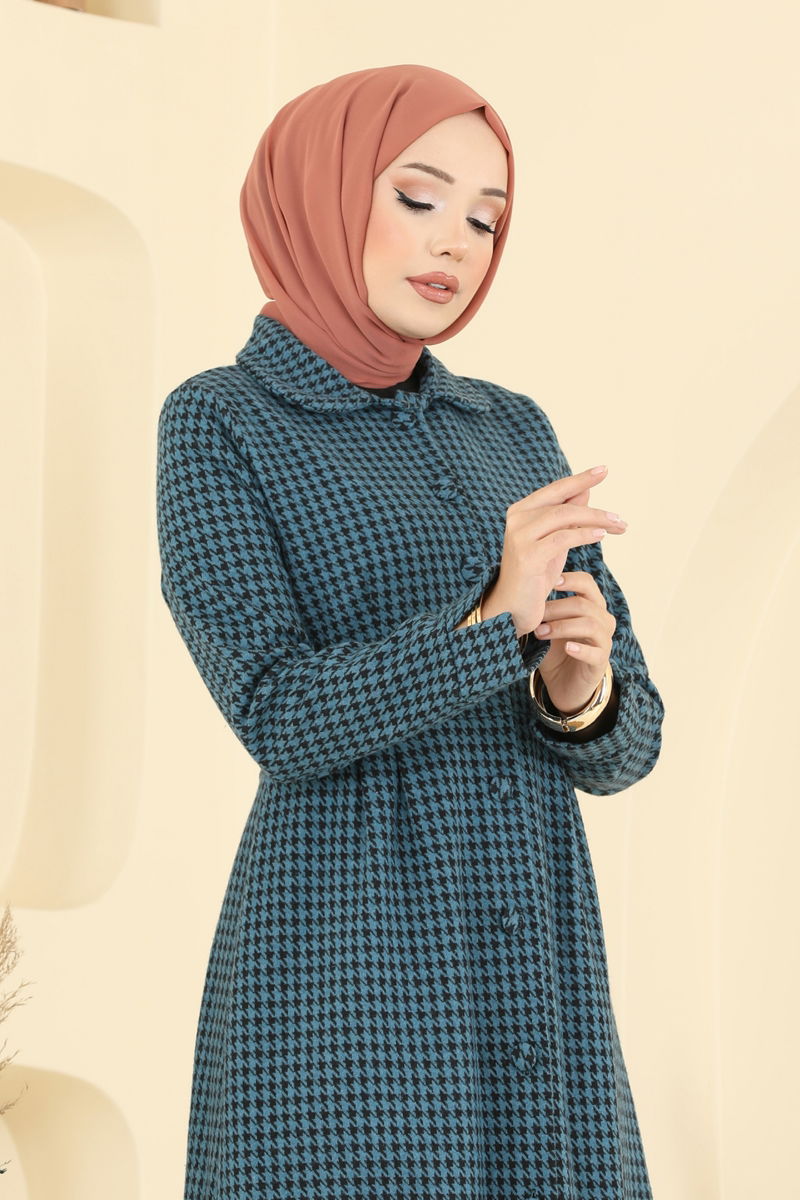 Kazayağı Desenli Gömlek Yaka Elbise 5081ERK1158-MS Petrol