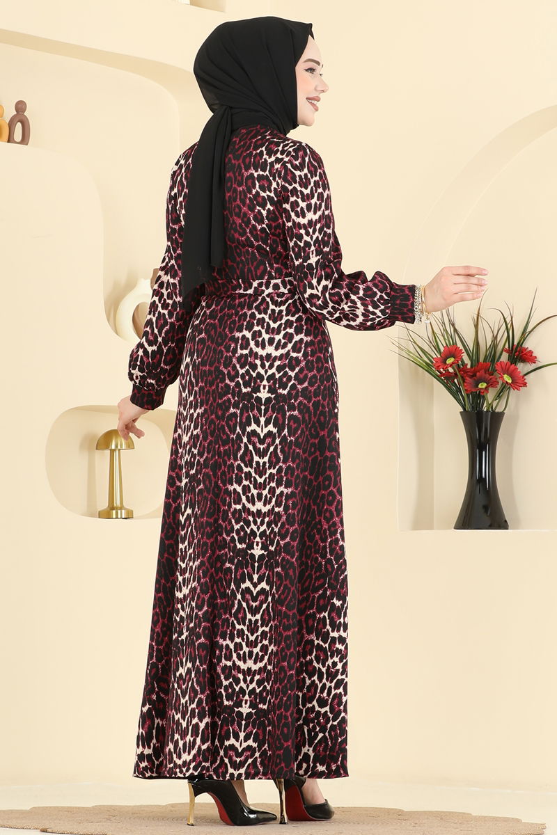 Kemer Detaylı Desenli Elbise 7575ERK1158-MS Desen 1 Bordo