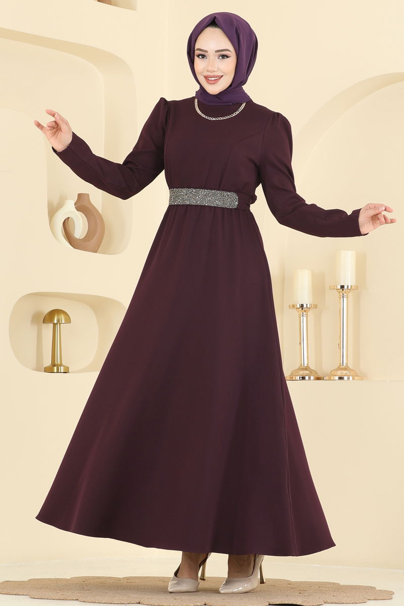 Kemeri Işıltılı Dabıl Elbise 2788SL432-MS Mürdüm