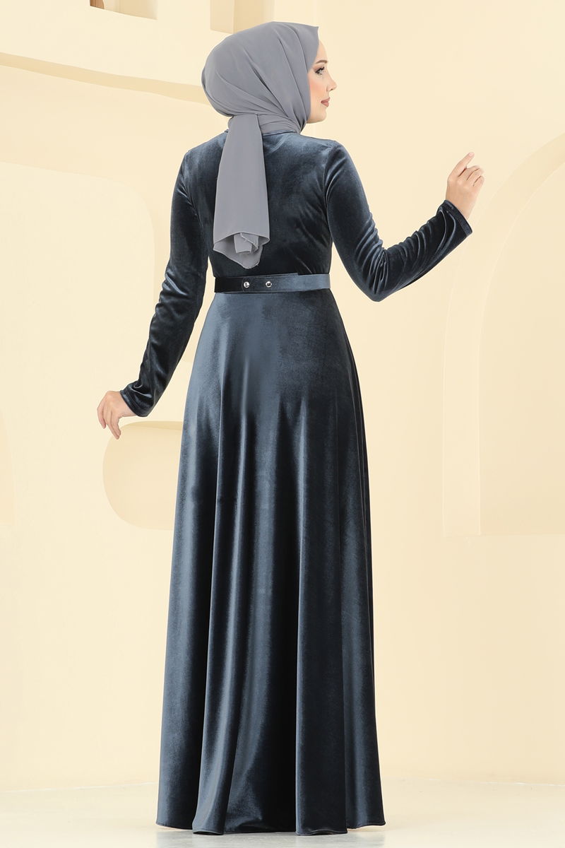Kemeri Taşlı Kadife Abiye Elbise 2013MEY846-MS Antrasit