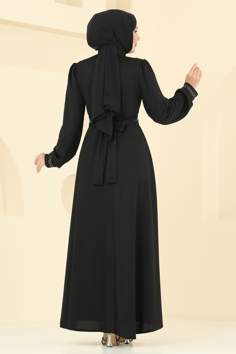 Kemeri Taşlı Krep Elbise 23030UKB139-MS Siyah