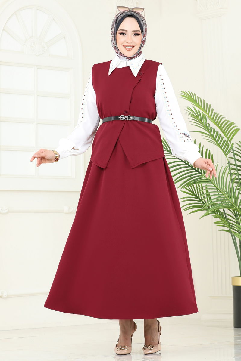 Tokalı Kemerli Etek ve Yelek Takımı - Bordo