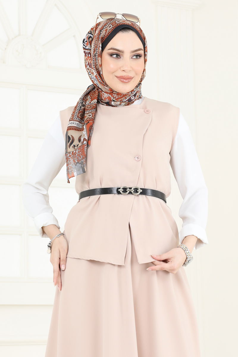 Ürün Detayları: Tesettür modasına uygun yeni sezon ürünüdür. Ürünün yakası ceket tipindedir ve ön kısmı düğmeli olarak tasarlanmıştır. Astarı yoktur. Kemer, ürünle birlikte verilir ve kullanımı opsiyoneldir. Görseldeki bluz ürüne dahil değildir, sadece kombin önerisi olarak sunulmuştur. Eteğin beli esnektir. Fotoğraf çekimlerinden dolayı renk tonlarında farklılıklar olabilir.