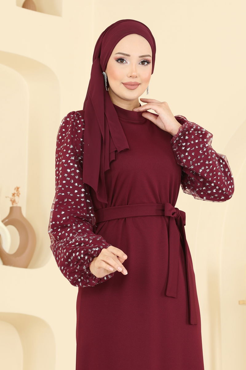 Kolları Simli Scuba Elbise 5726EDF311-MS Bordo