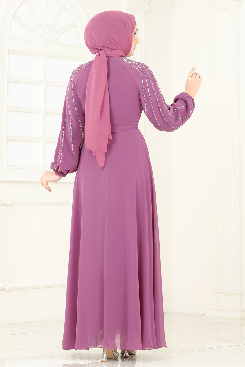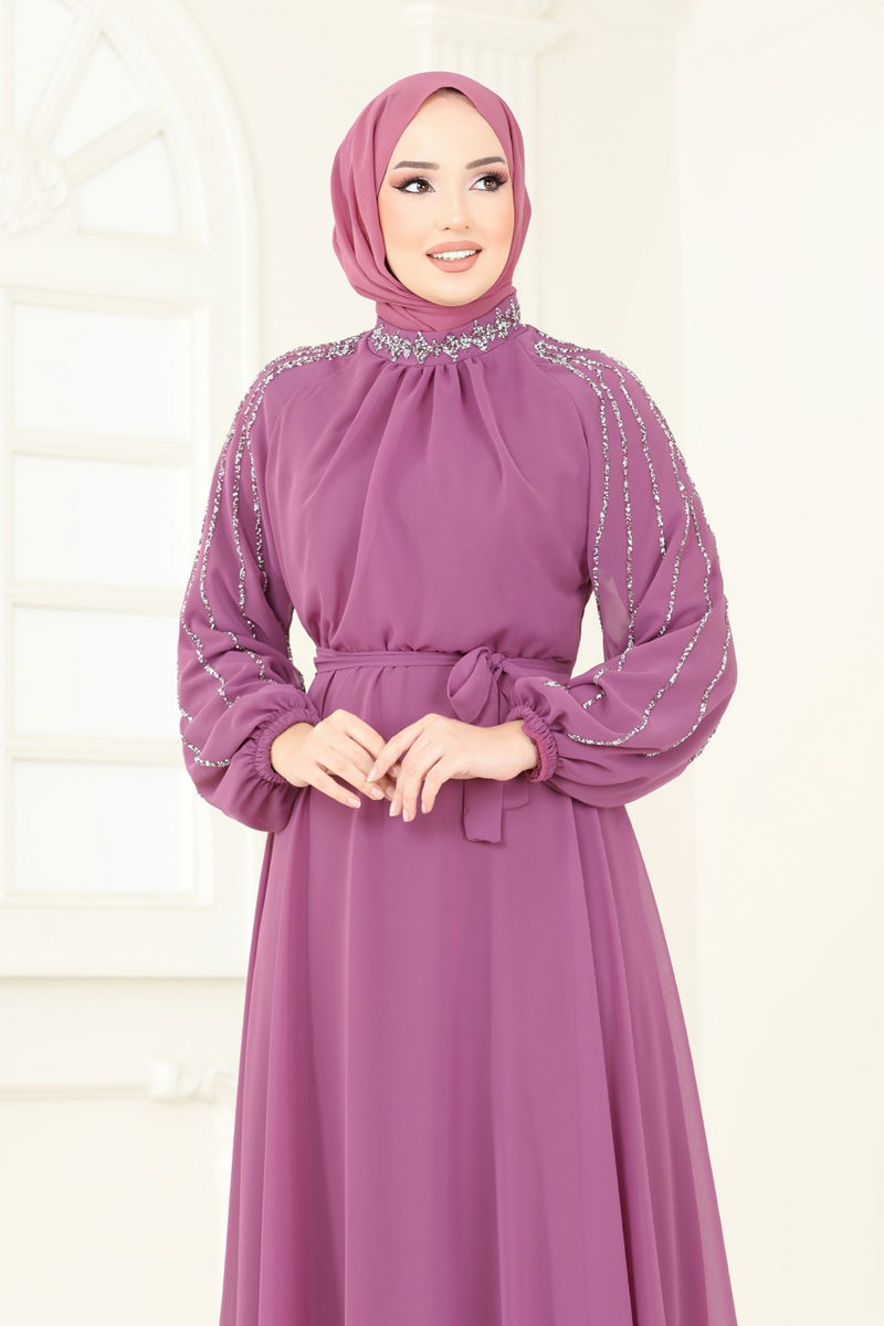Elegant and stylish, the Bejeweled Sleeve Chiffon Gown is a modest attire suitable for all seasons. This chic dress is made from chiffon and maintained exclusively through dry cleaning, ensuring durability and a classy look. It features a high collar neck and a zipper closure at the back for ease. Adorned with glued jewels on the sleeves, it brings a dazzling shine. The gown includes an integrated belt that can be styled with or without, depending on your preference, and the elastic cuffs offer a comfortable fit. Craft the look you desire with or without the belt.