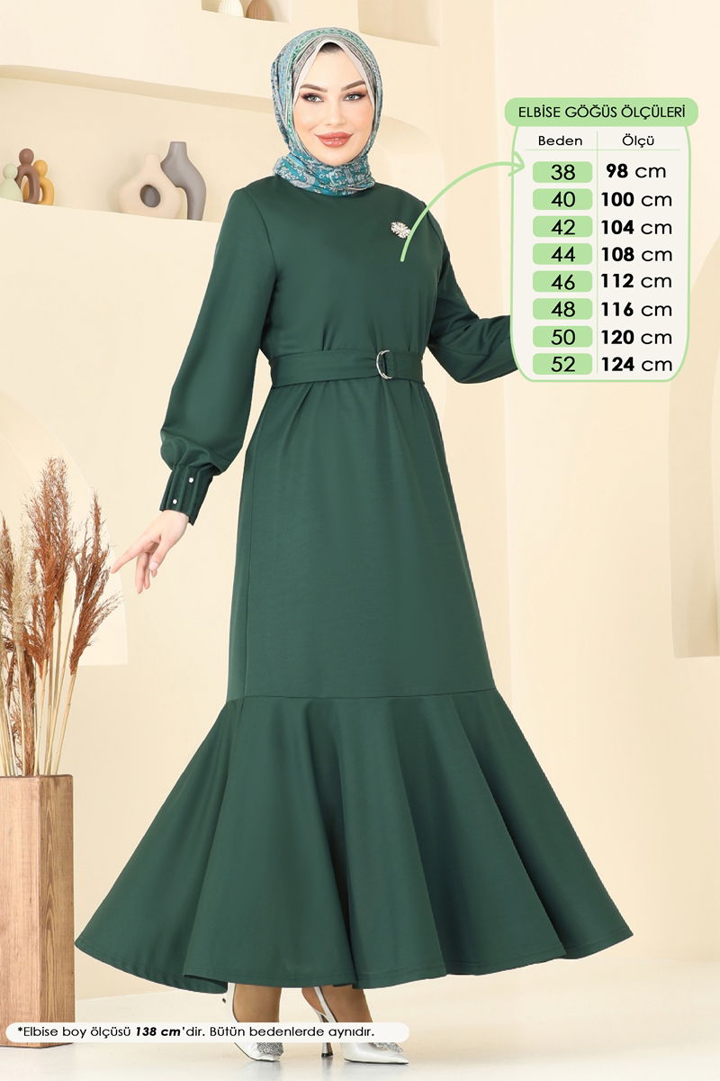 Bu zümrüt yeşili tesettür elbise, yılın her mevsimi giyilebilir. Dabıl kumaştan imal edilen bu şık parça, yaka bölgesinde bisiklet yakası ve astarsız oluşu ile maksimum konfor sağlar. Hassas yıkamada 30 derecede temizlenebilir ve taş detaylı kolları ile göz alıcı bir görünüm sunar. Tasarımında bulunan kemer, dalgalanmayı önler ve isteğe bağlı olarak çıkarılabilir. Üzerinde sergilenen modelin bedeni 38'dir.ELBİSE BEDEN ÖLÇÜLERİ (CM)Beden Göğüs Boy 38 98 138 40 100 138 42 104 138 44 108 138 46 112 138 48 116 138 50 120 138 52 124 138 Ağırlık(Kg):0.57 -