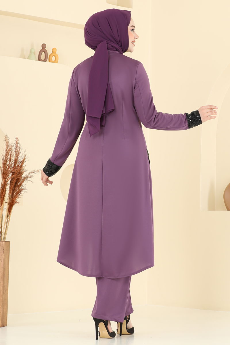 The Beaded Sequin Set with Necklace is a stylish and comfortable hijab clothing item. Suitable for all seasons, this set can be gently washed at 30 degrees. Made from Mira fabric, it features a crew neckline and is unlined. The product stands out with its zippered back and sewn sequin details. The included necklace can be optionally removed, and the trousers have an elastic waist. Available in various sizes to suit every woman's style needs.