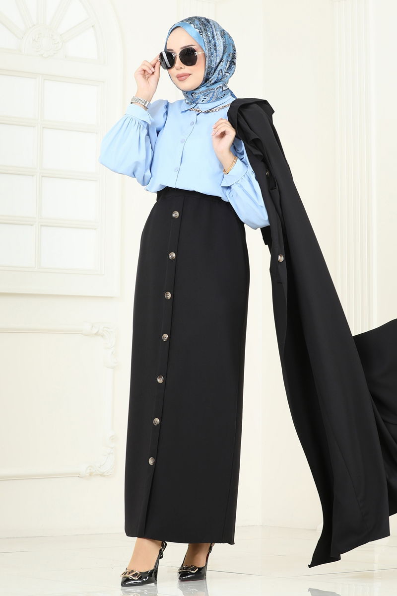 يوجد زر متاح من الأمام. المنتج لديه ياقة مفتوحة. غير مبطنة. أزرار التنورة إكسسوارات. الحزام متضمن، ،يمكن استخدامها حسب الرغبة البلوزة غير متضمنة. صُنعت عينة من المجموعة مع البلوزة لإظهار الاستخدام المقصود للمنتج. الملحقات غير متضمنة. تفاصيل الجيب من الملحقات. .خصر التنورة مرن قد يكون هناك اختلاف في الدرجة اللونية في المنتج بسبب التقاط الصور الفوتوغرافية.