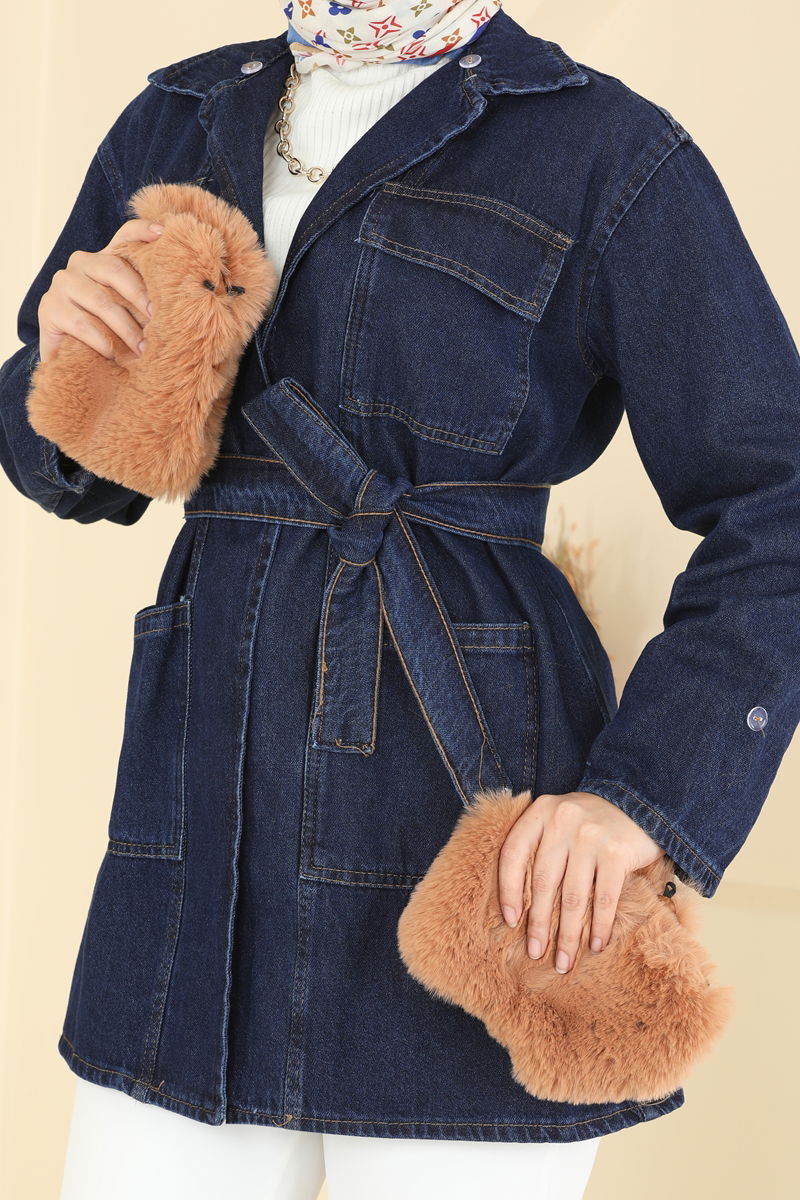 Denim Kürk Detaylı Ceket - Koyu Mavi