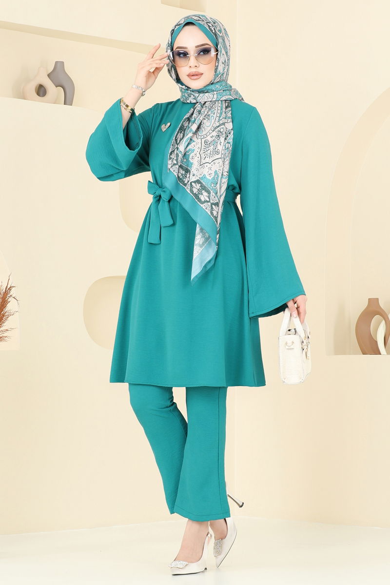 The Belted Aerobin Set combines elegance and comfort in modest clothing. Suitable for all seasons, this model is made from special Aerobin fabric, which is light and breathable. The product is suitable for delicate wash and can be washed at 30 degrees. Featuring a bike collar and unlined design, the set includes both a tunic and pants, with an elasticated waist for comfortable wear. The belt is stitched at the ends to prevent waving and can be removed optionally. The Belted Aerobin Set, ideal for both everyday and special occasions, lets you express your style.