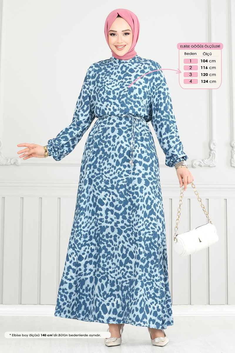 Leopar Desen Viskon Elbise 803OZN1046-MS İndigo