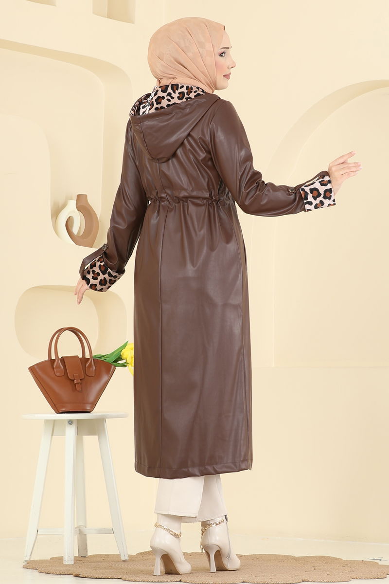 Kahverengi Deri Tesettür Kap ile Leopar Dokunuşu