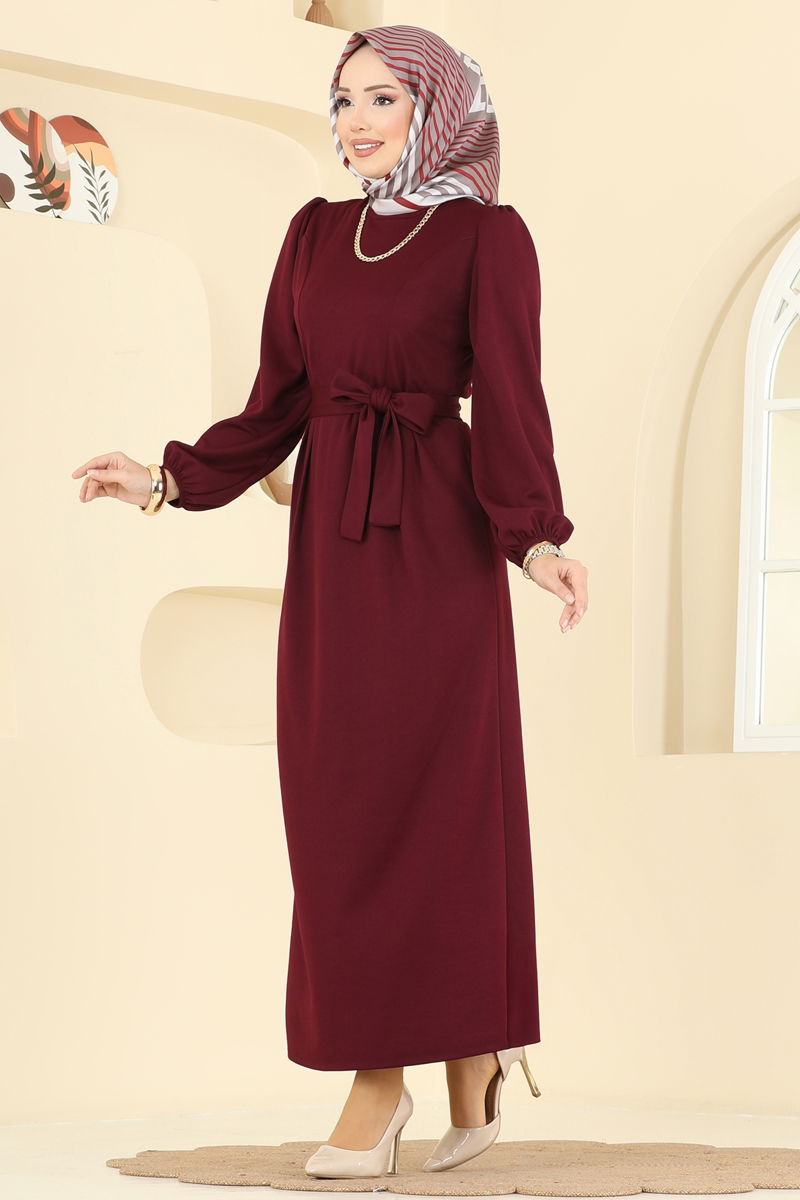 Manşet Lastikli Kuşaklı Elbise 25008UKB139-MS Bordo